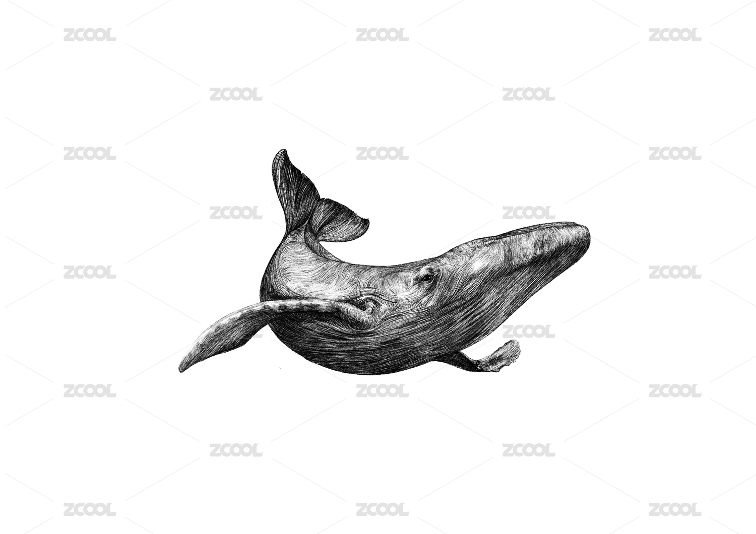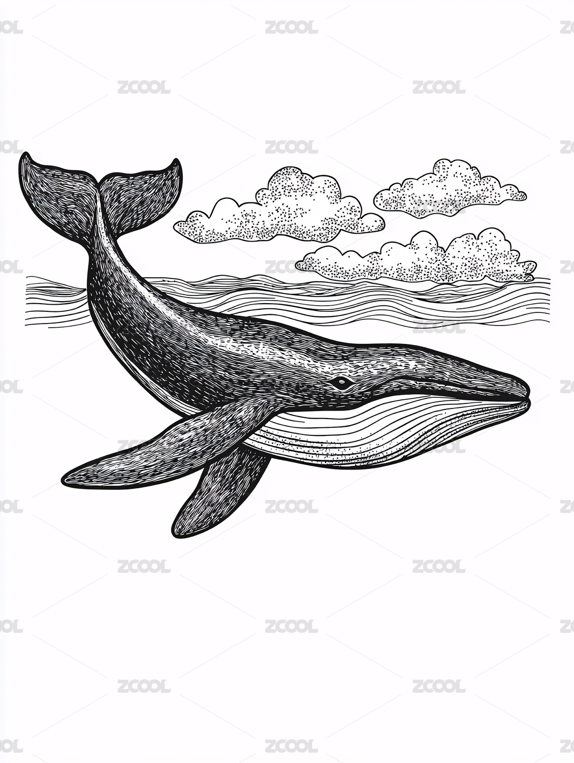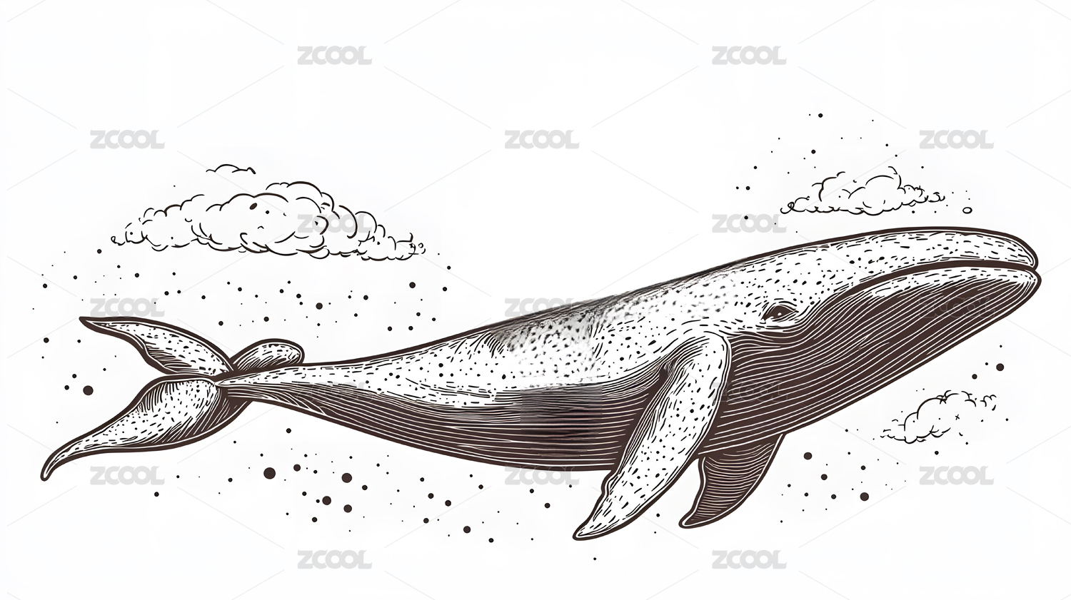 治愈系唯美插画一条蓝色的鲸鱼在遨游