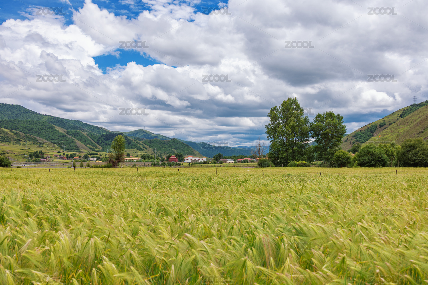 蓝天白云下的青稞地民居