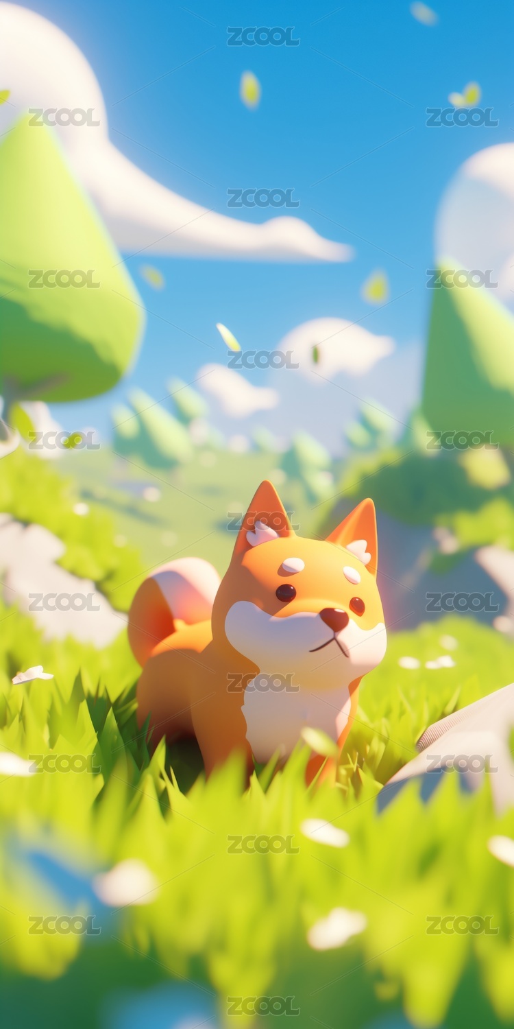 白天晴天绿色原野的宠物狗3D立体卡通插画