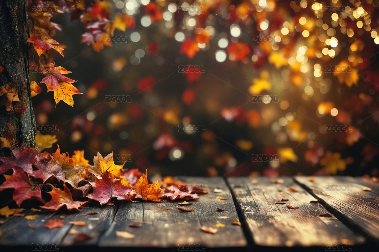 秋季,落叶,户外,展台,木板,展示台,木质,黄叶,叶子,植物