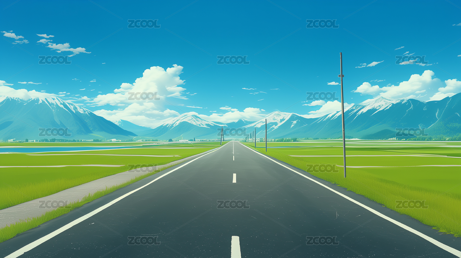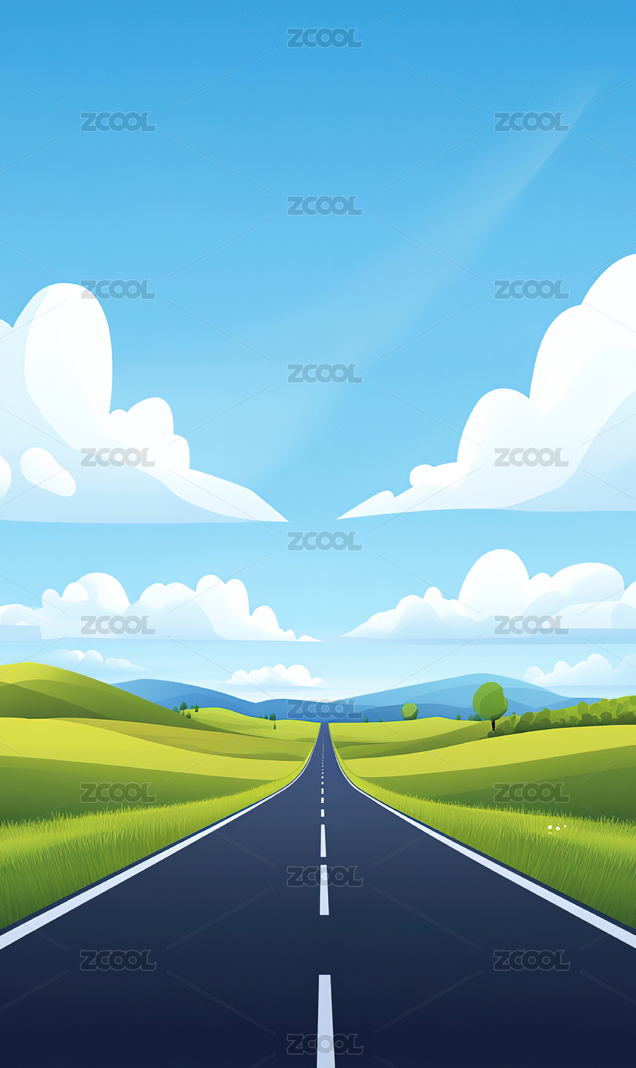 公路草原山天空清新插画