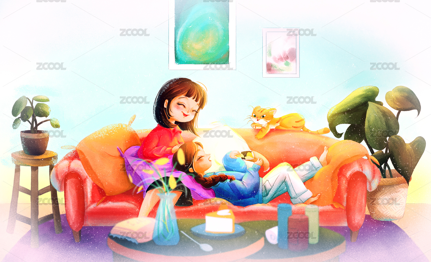 闺蜜两人在一个温暖的午后躺着吃零食聊天