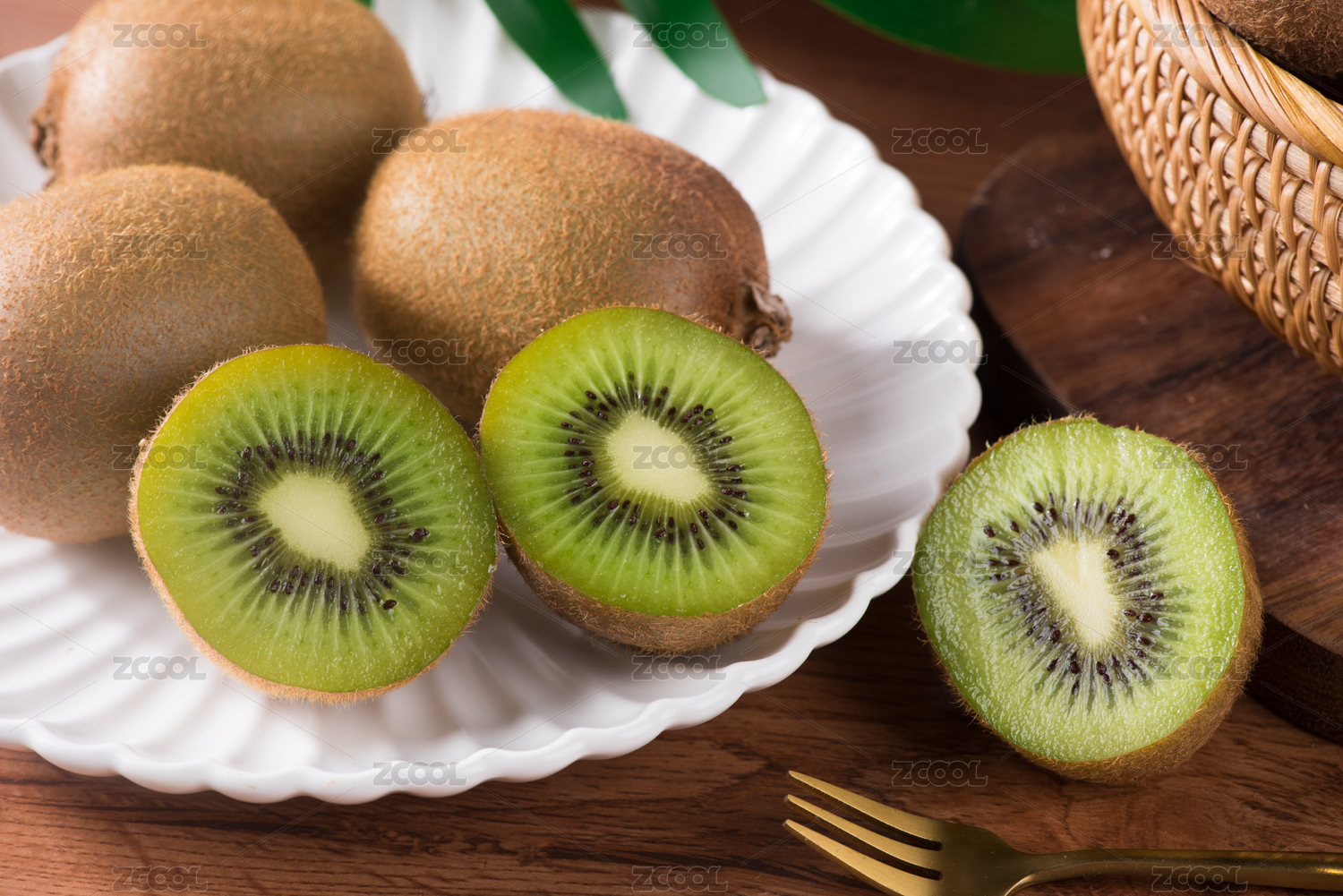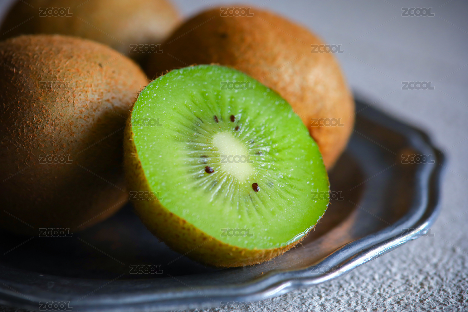 盘子里放着猕猴桃和切面的徐香绿心猕猴桃