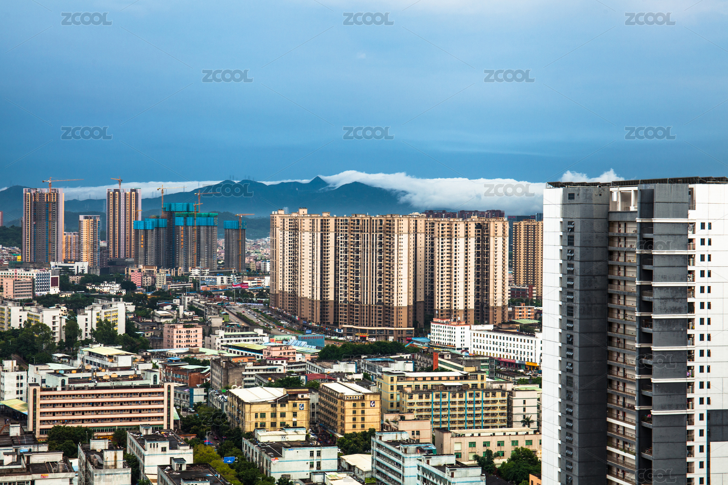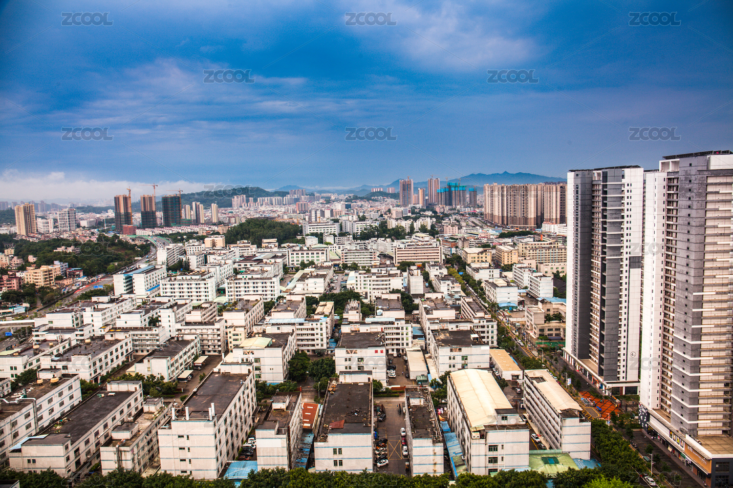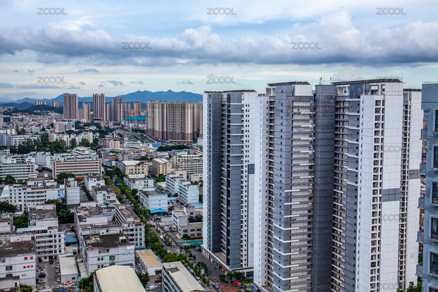 蓝天白云下的中国深圳市郊区住宅建筑群风光