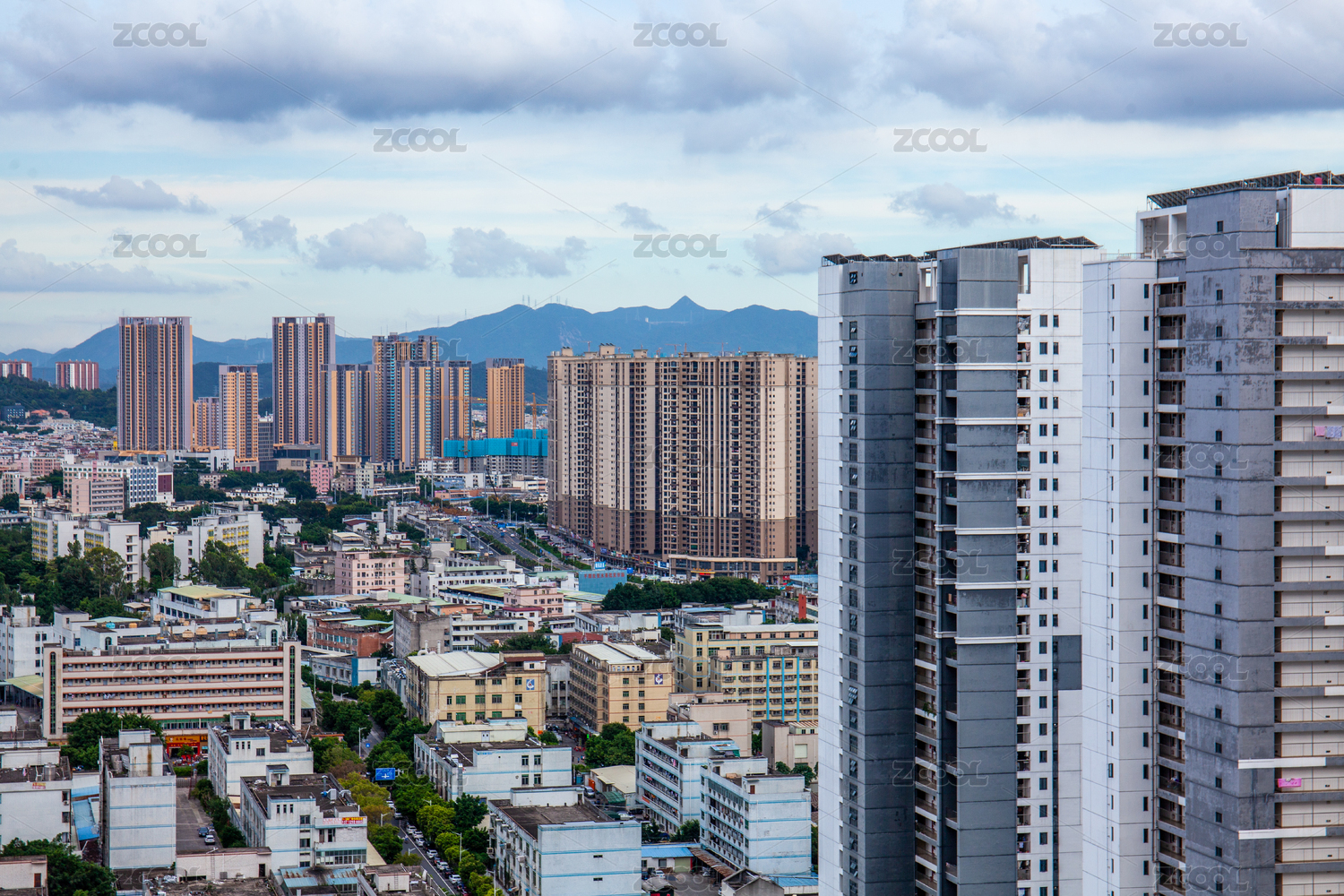 蓝天白云下的中国深圳城市郊区住宅建筑群风光