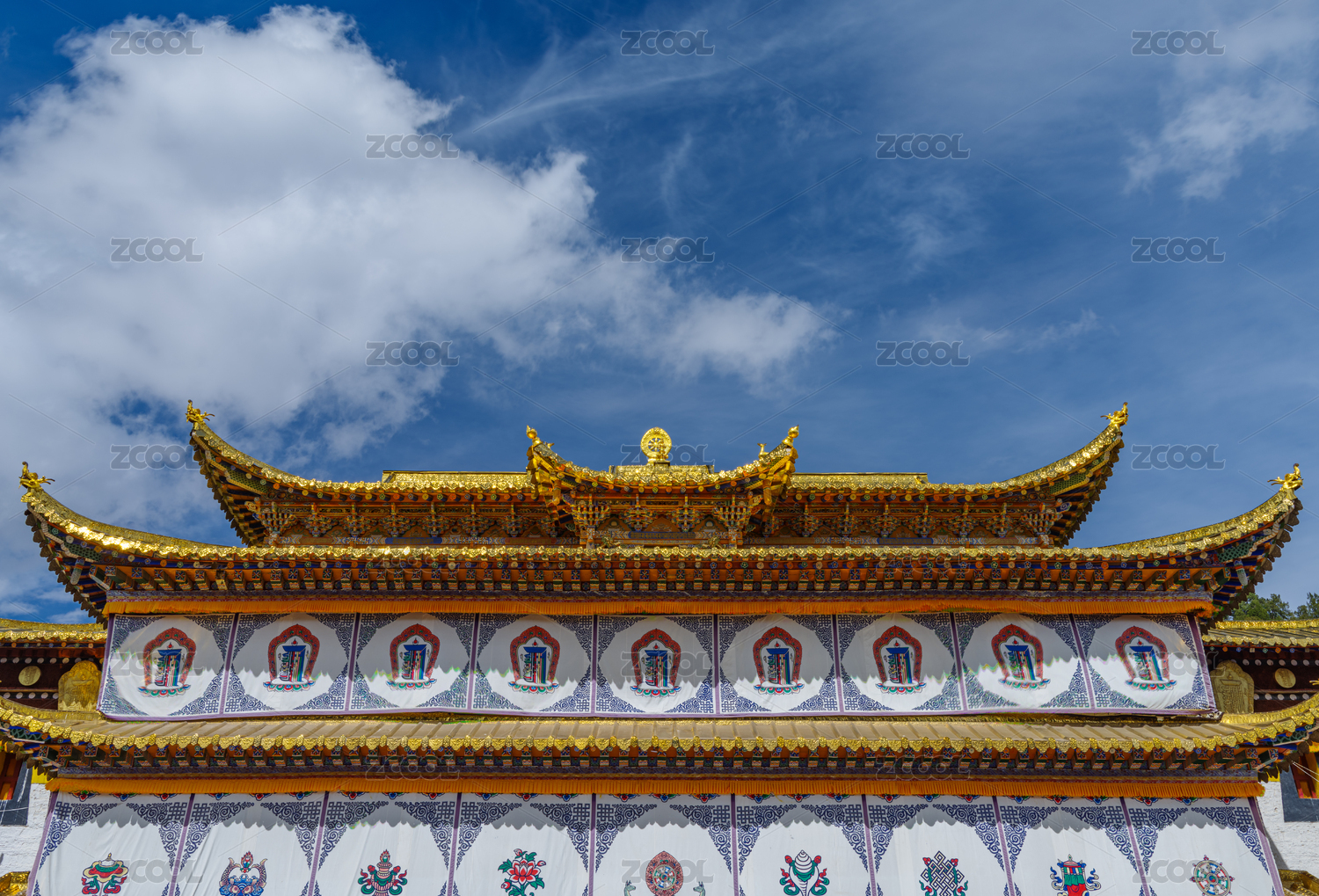 阿坝州松潘县川主寺藏族寺庙金色的屋檐特写