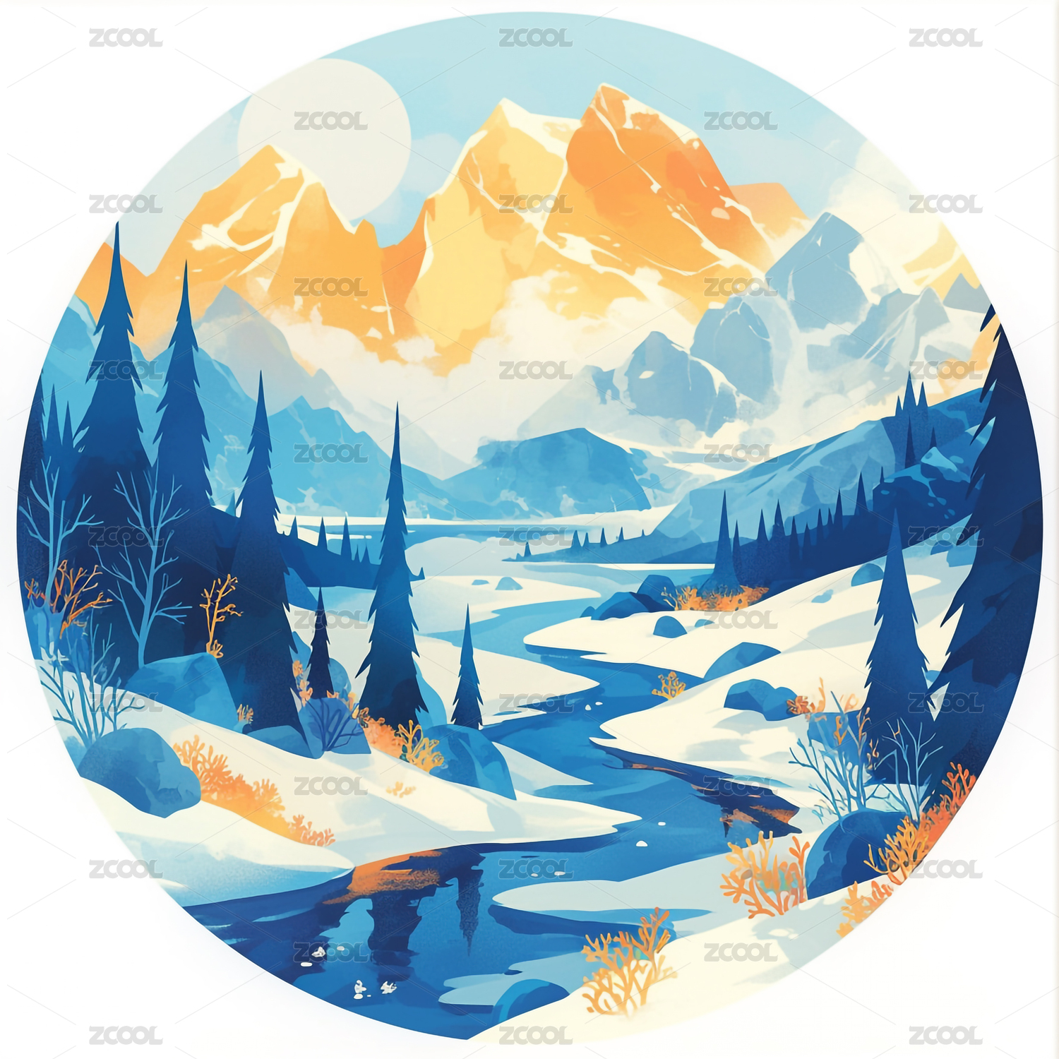 日出,雪山,山峦,冰川,大树,松树,简约,艺术,复古,美式