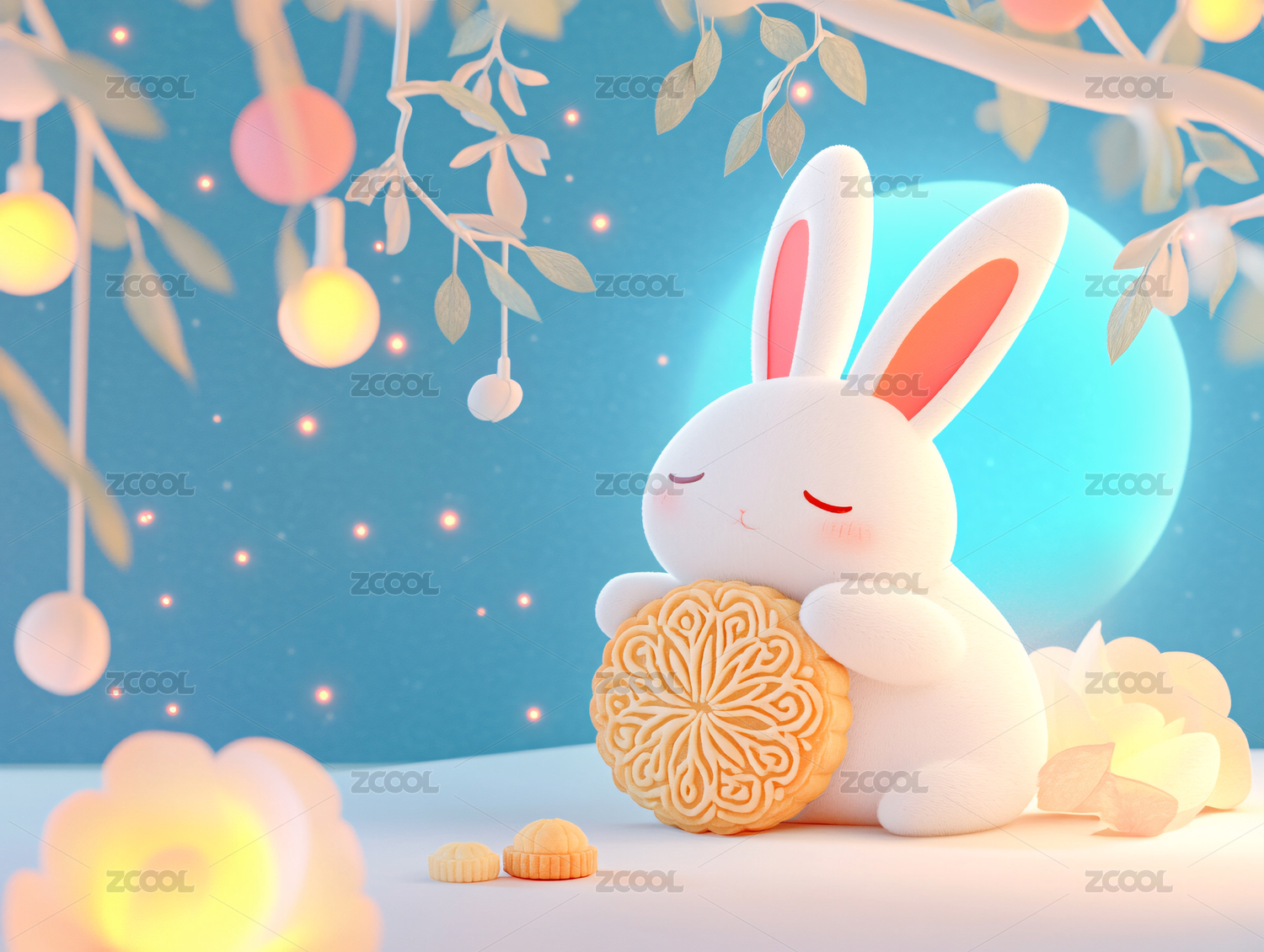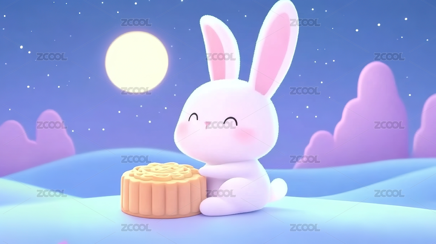 中秋节满月背景下正在吃月饼的可爱玉兔
