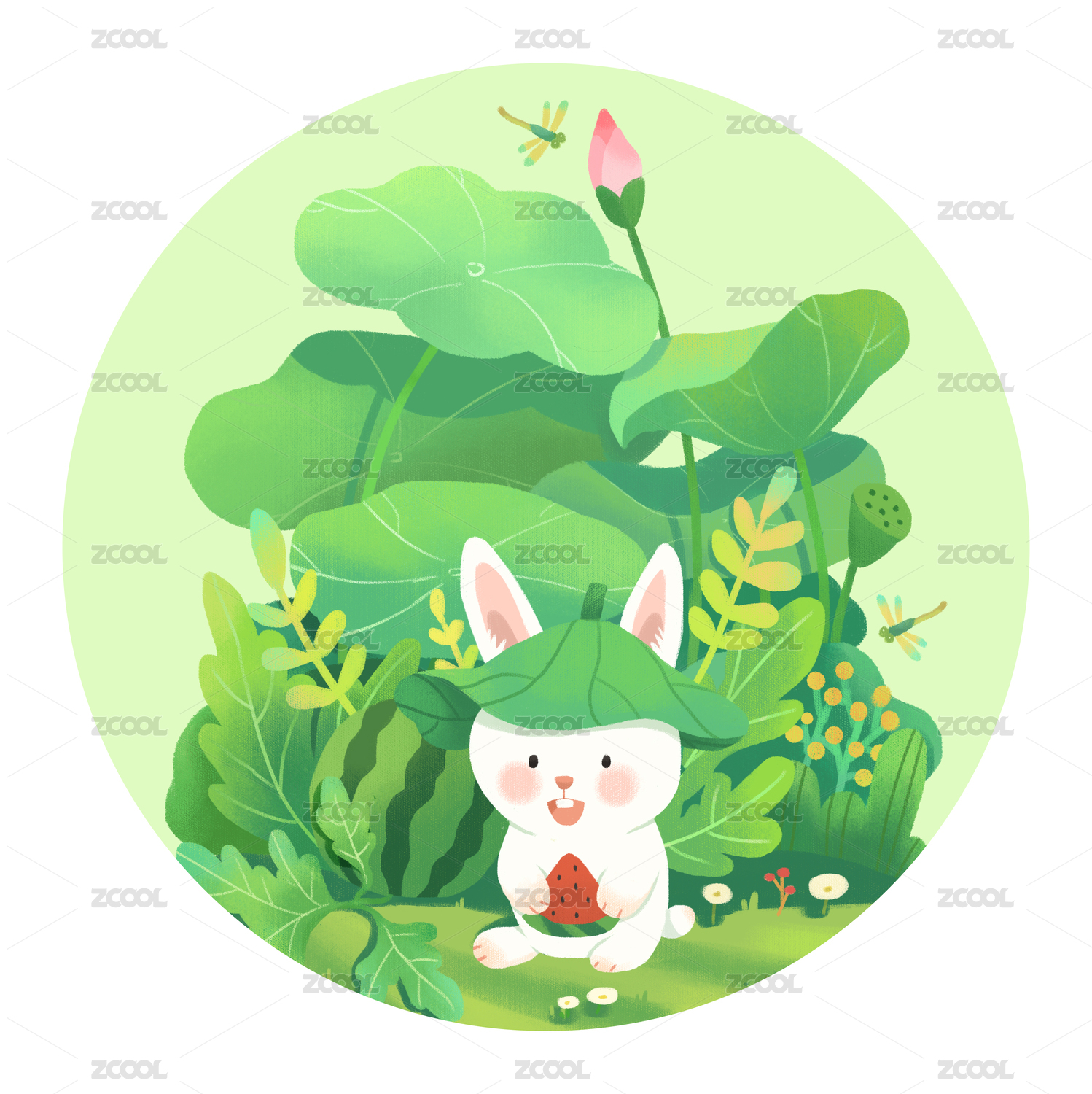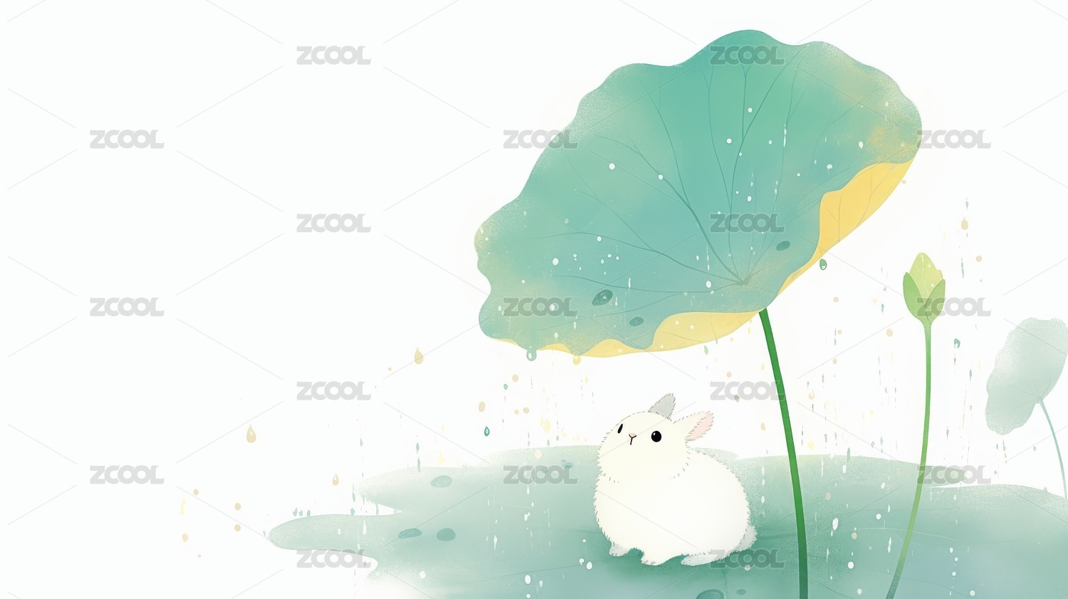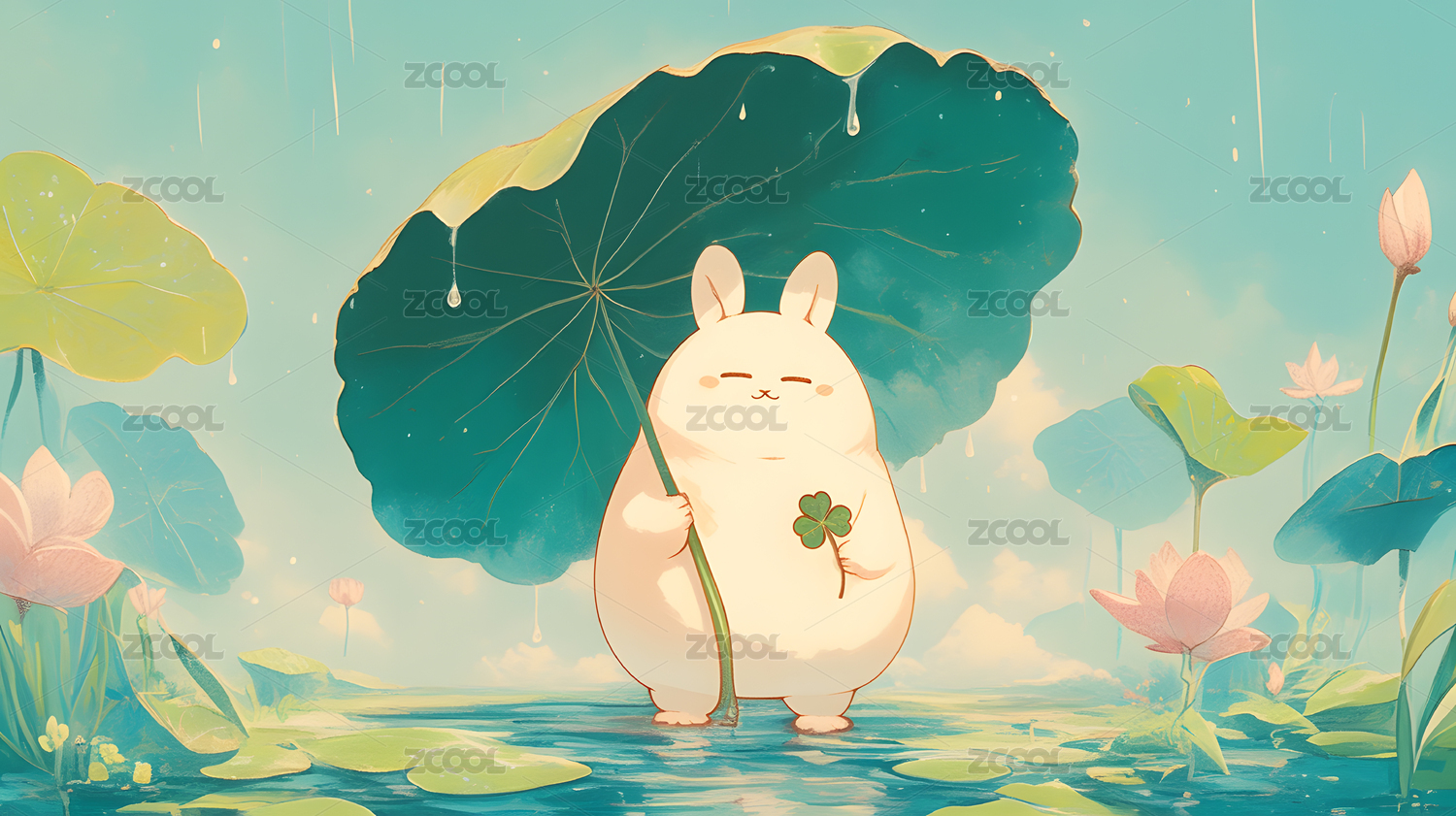 卡通小兔子在雨中用荷叶打伞儿童绘本插画植