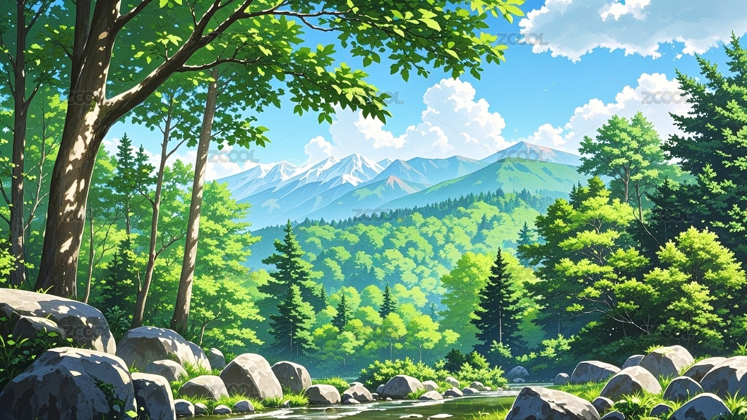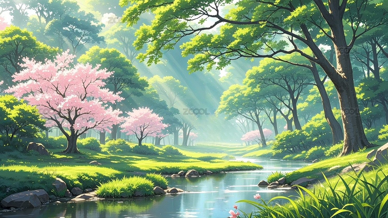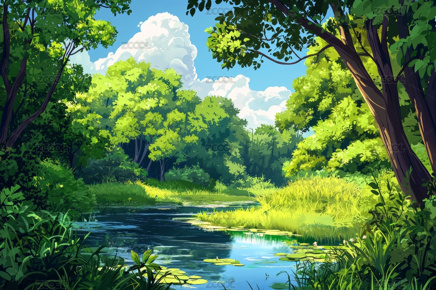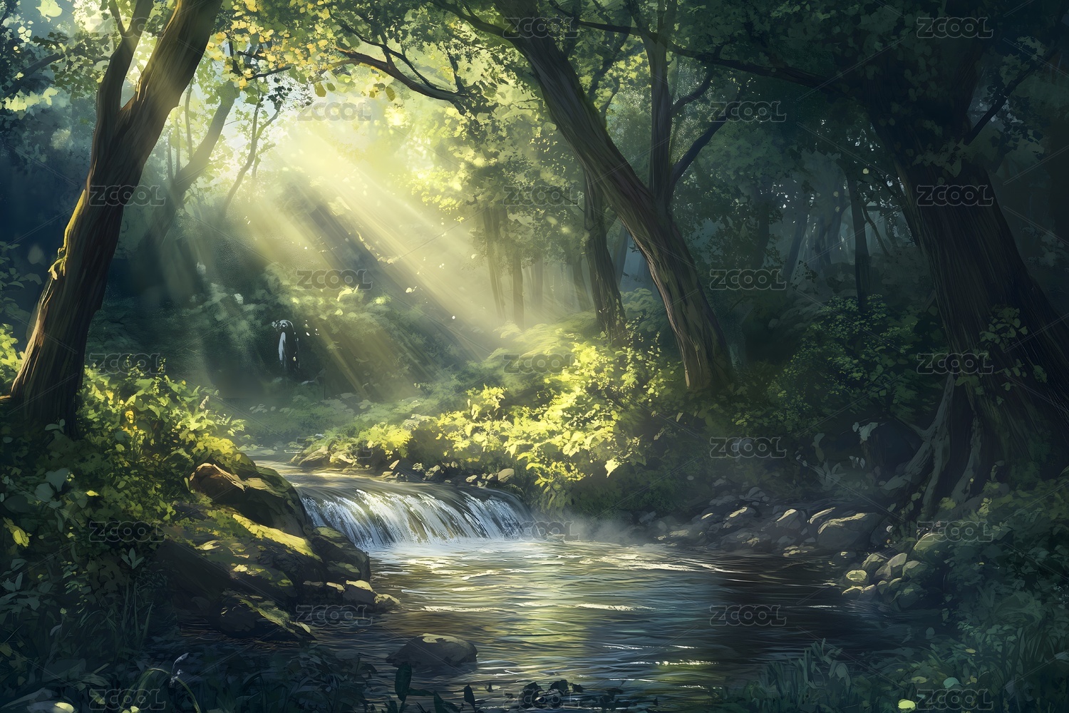 森林溪流风景插画