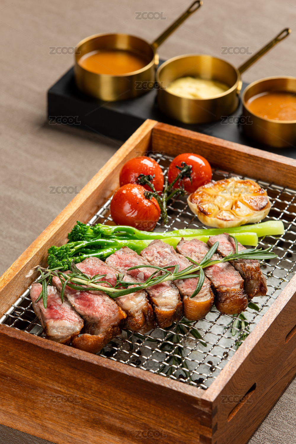 一盘M9和牛拼盘摆盘放桌子上