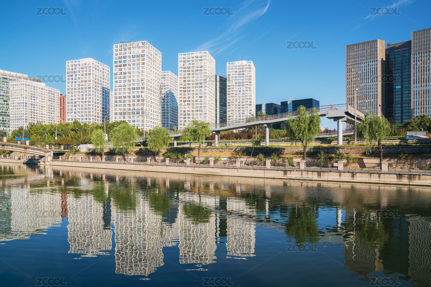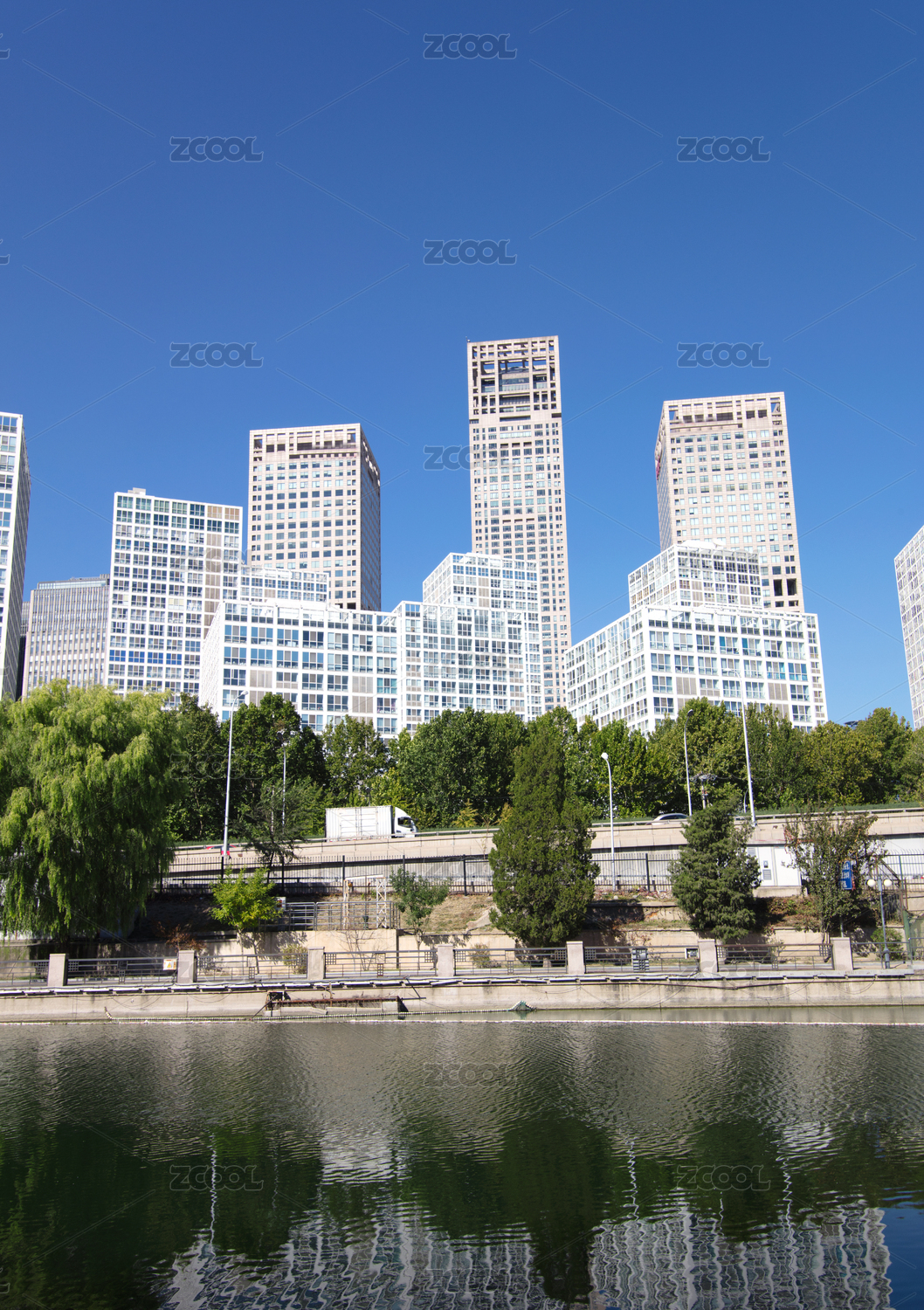 晴朗天气蓝天下中国北京通惠河畔CBD现代建筑及河里的倒影