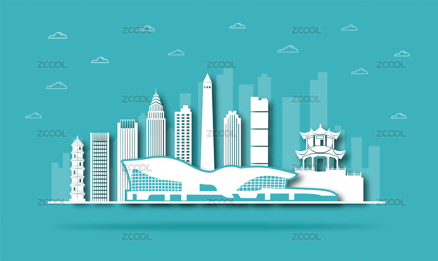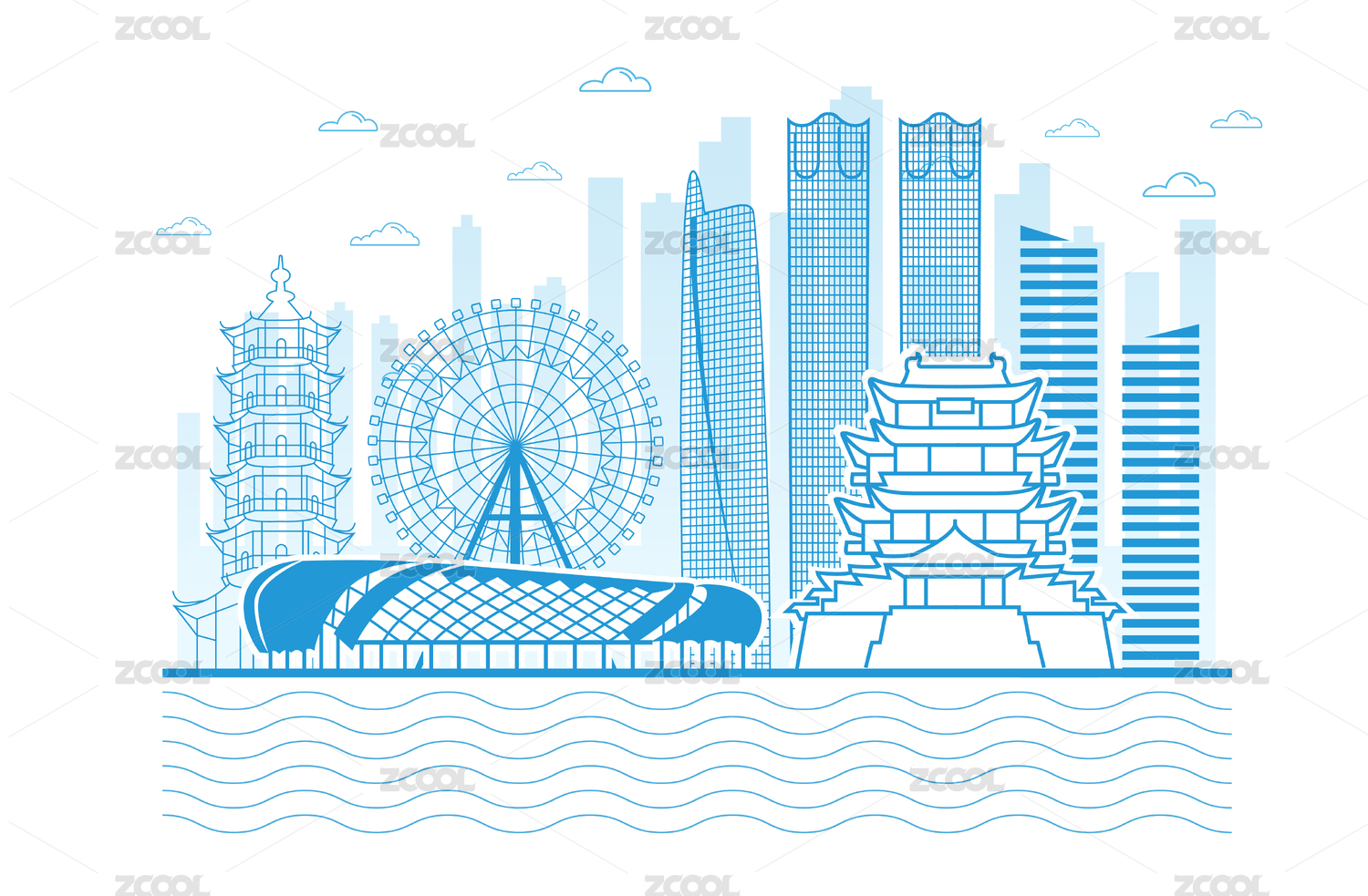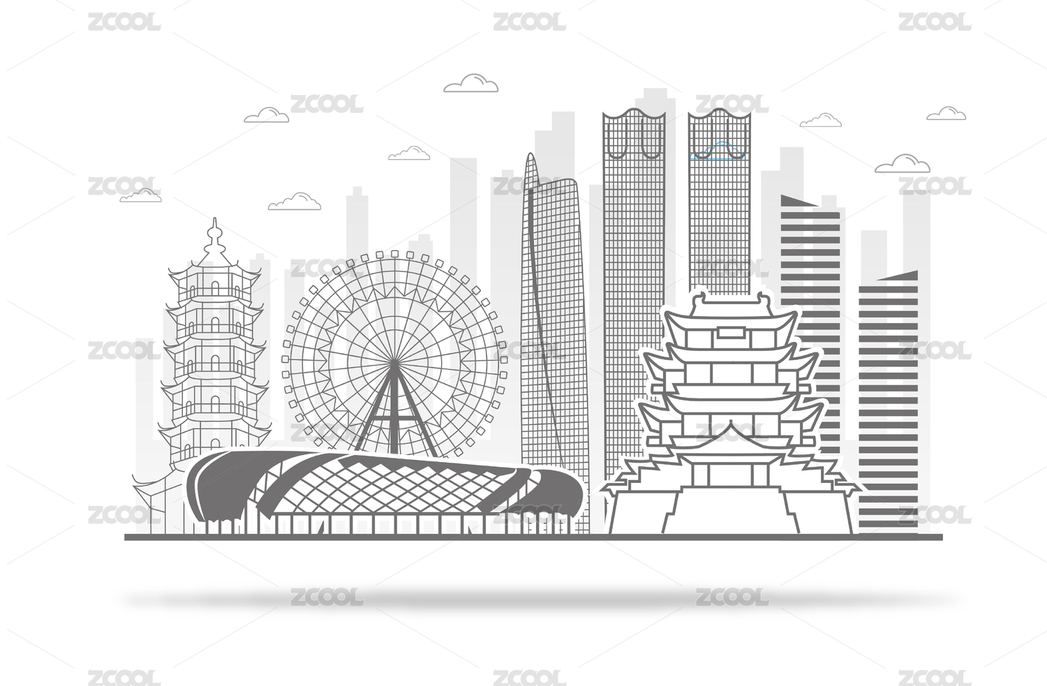 中国,南昌,江西,城市,高楼,建筑,天际线,矢量,线描,插画