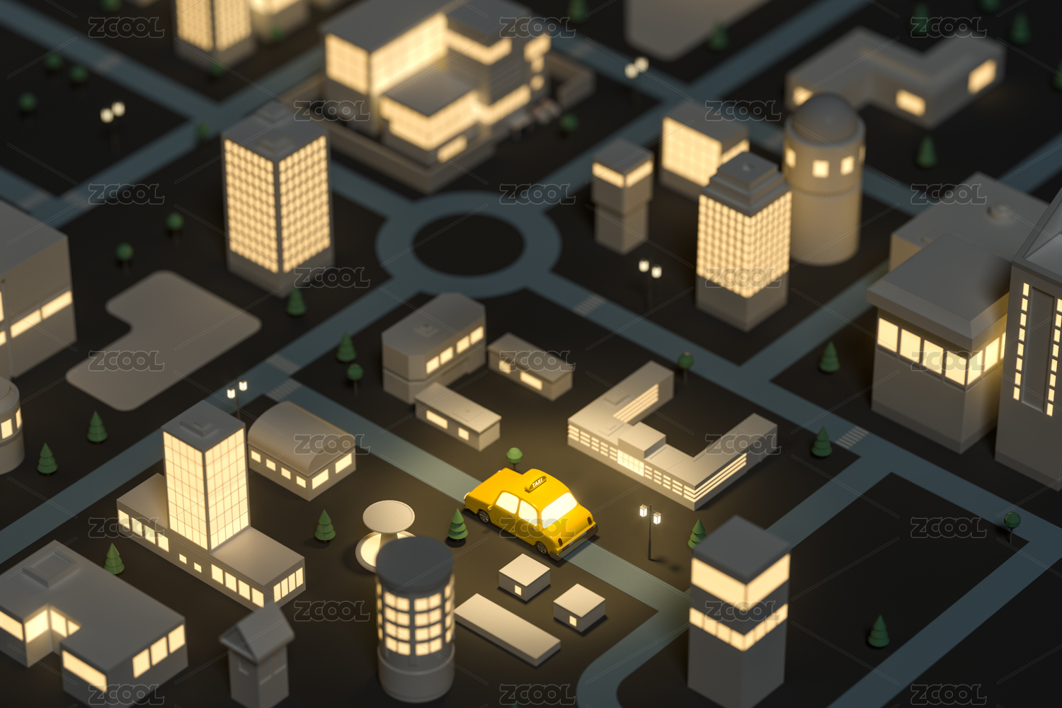 夜晚迷你都市里的出租车 3D渲染