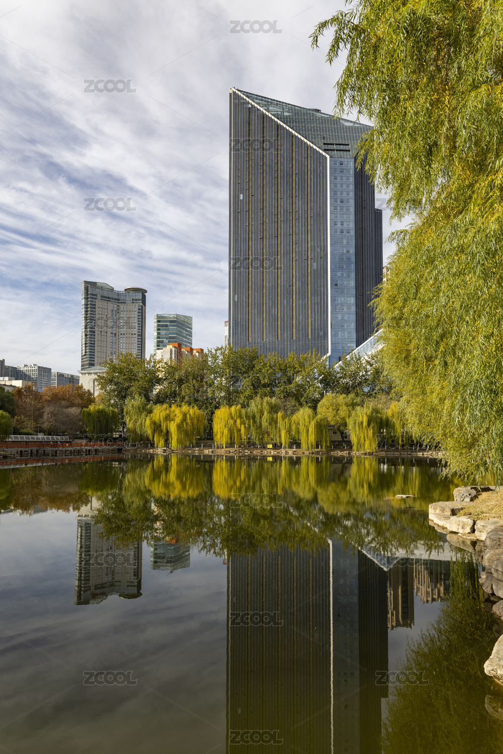 中国上海陆家嘴中心绿地人工湖与写字楼