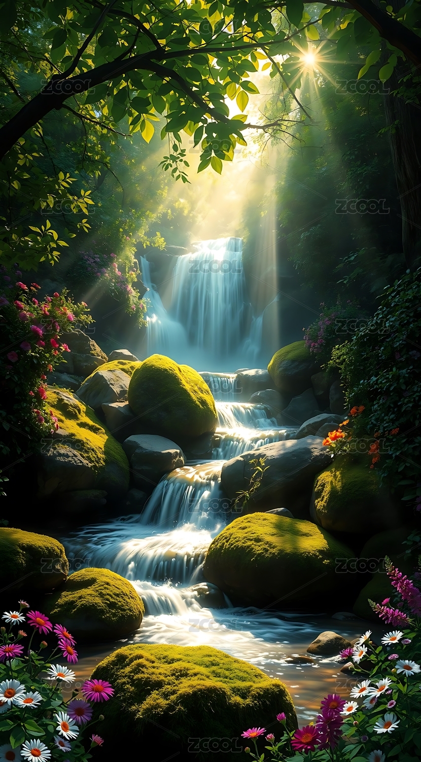 阳光穿透森林照耀着覆盖青苔的小溪和岩石