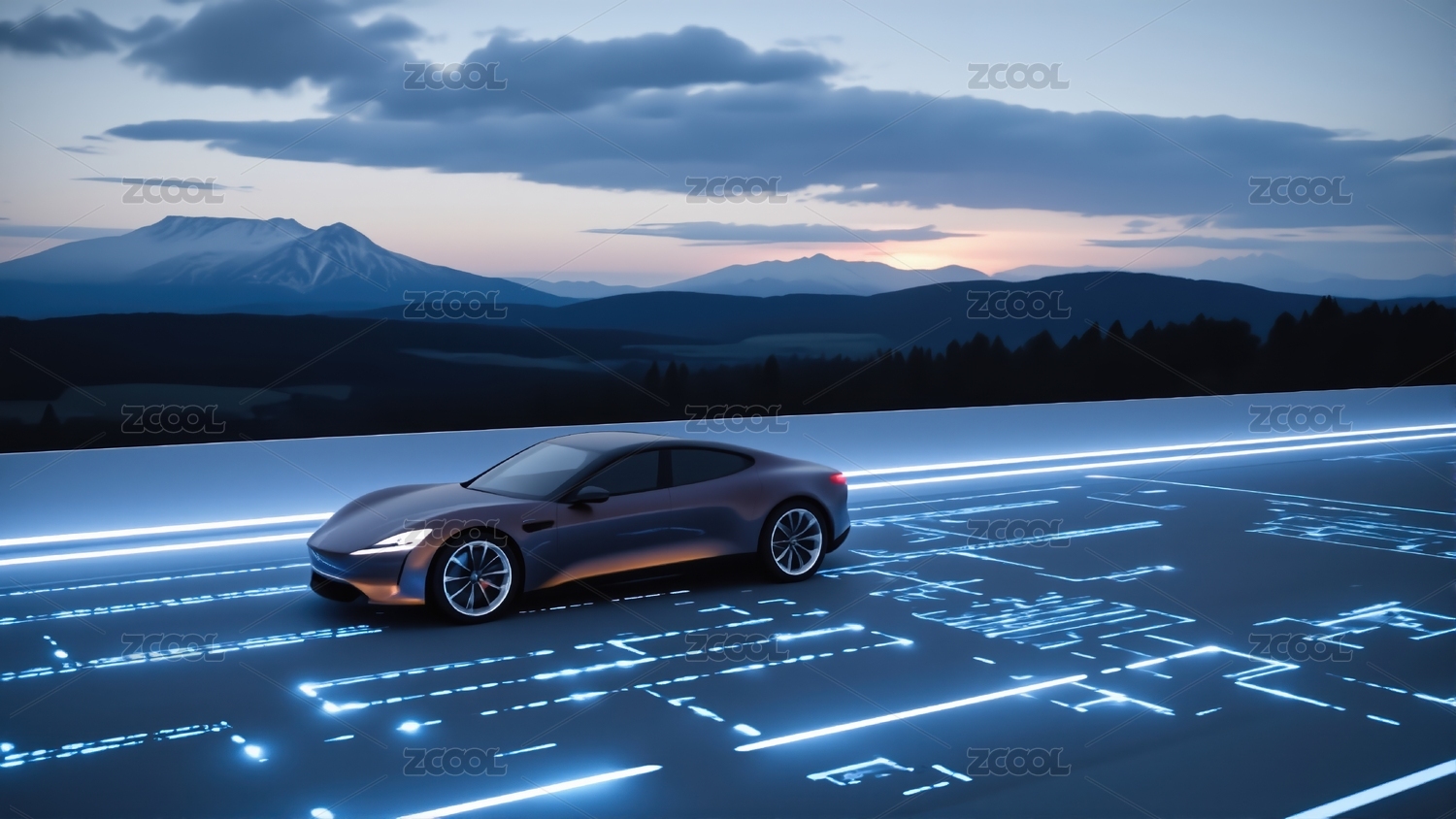 未来赛车驶向梦幻山峦