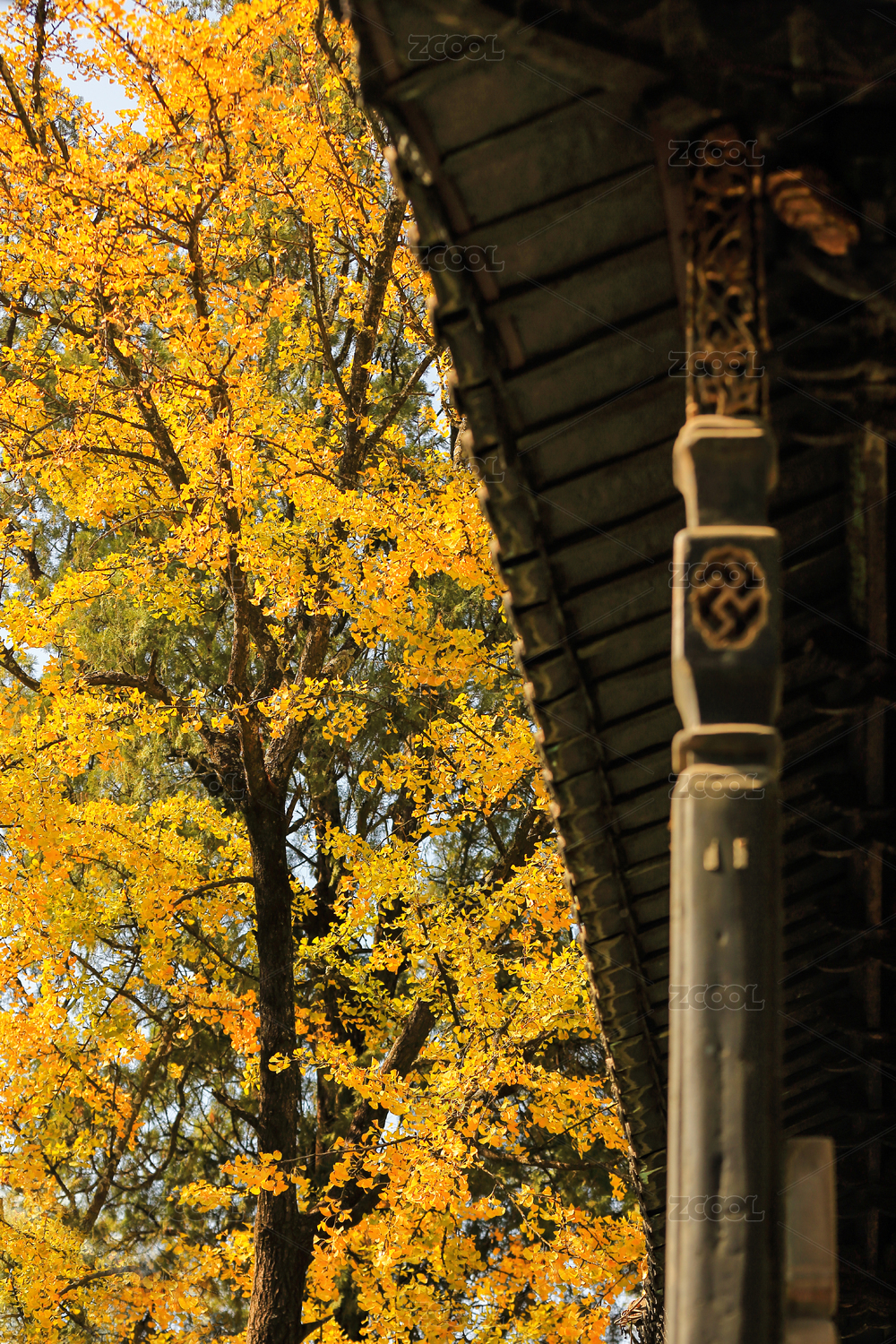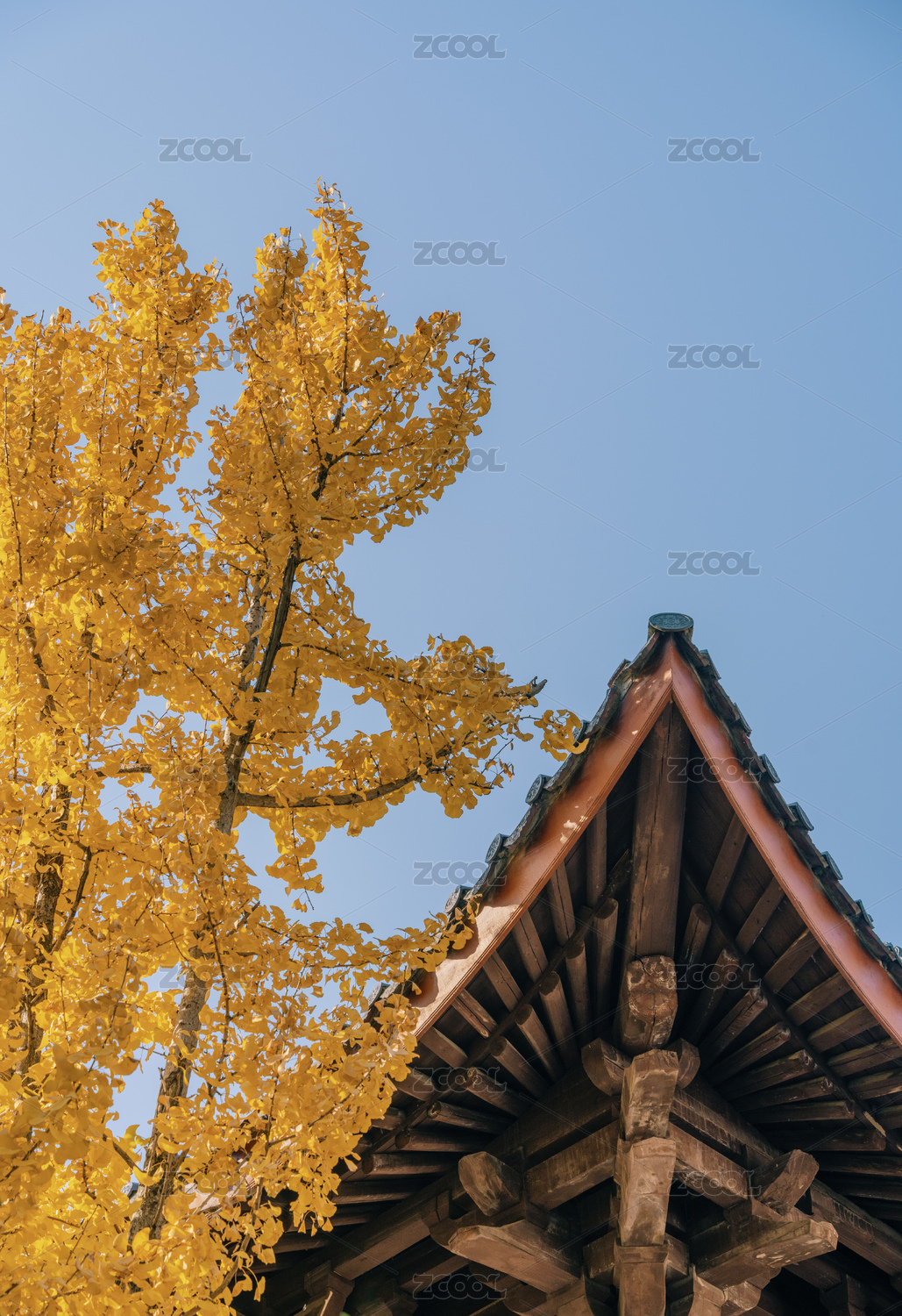 柳州灵泉寺 蓝天下的银杏树与榫卯结构建筑