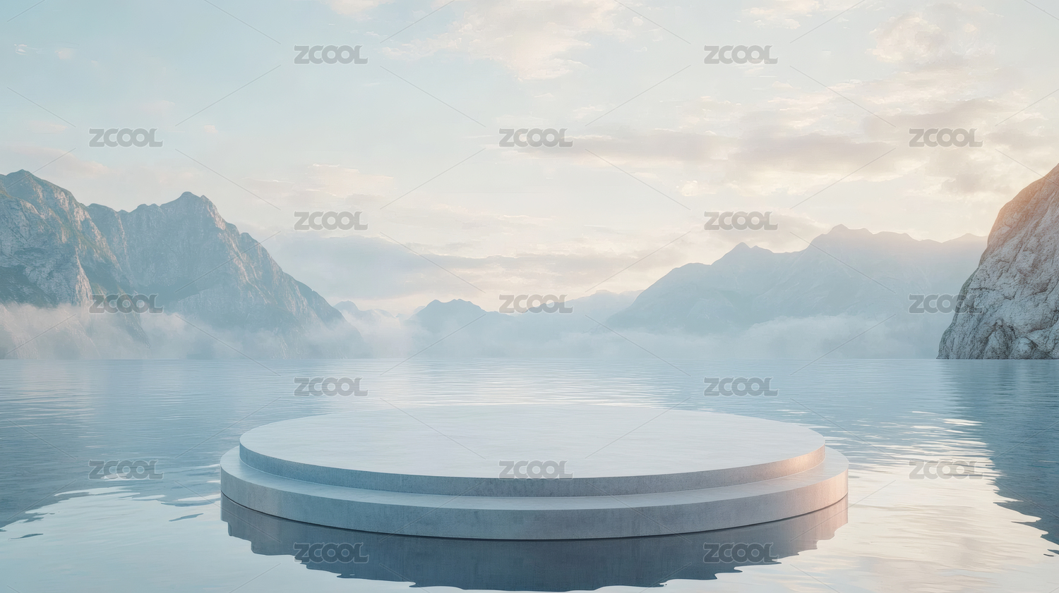 平静湖面上的白色圆形展示台