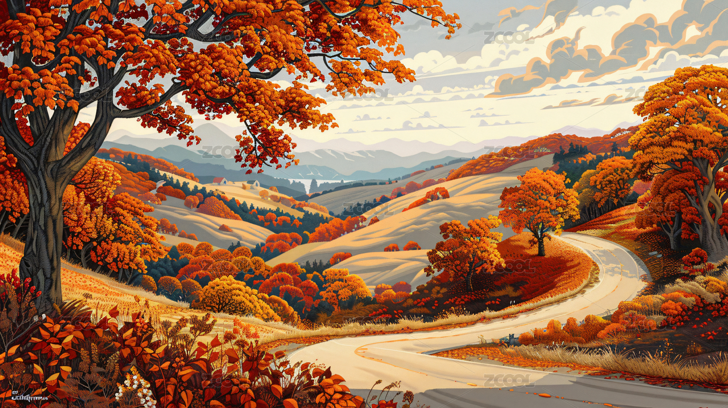 风景秀丽秋季道路穿过鲜艳橙色树叶