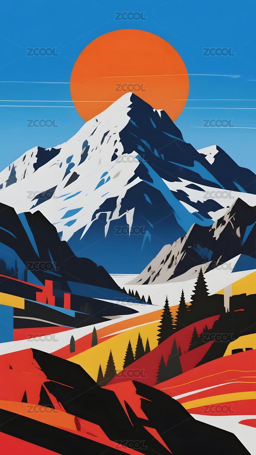 山林雪山夕阳风景插画