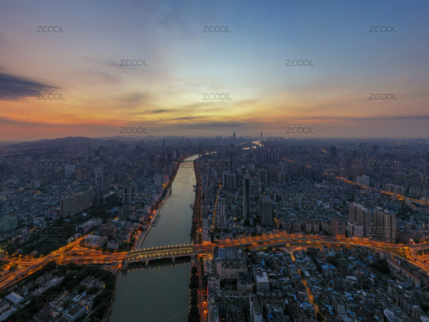 航拍广州珠江两岸城市天际线日落黄昏全景