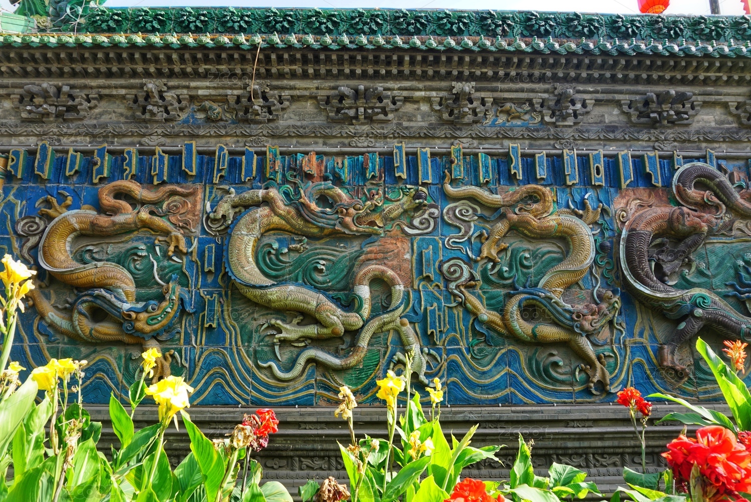 中国山西省平遥古城内的琉璃九龙浮雕影壁