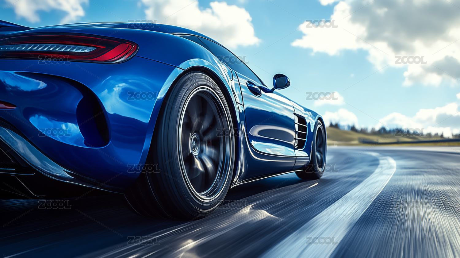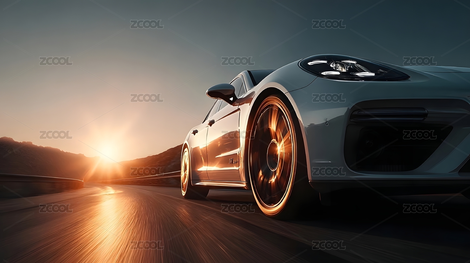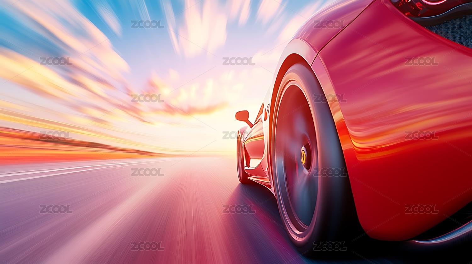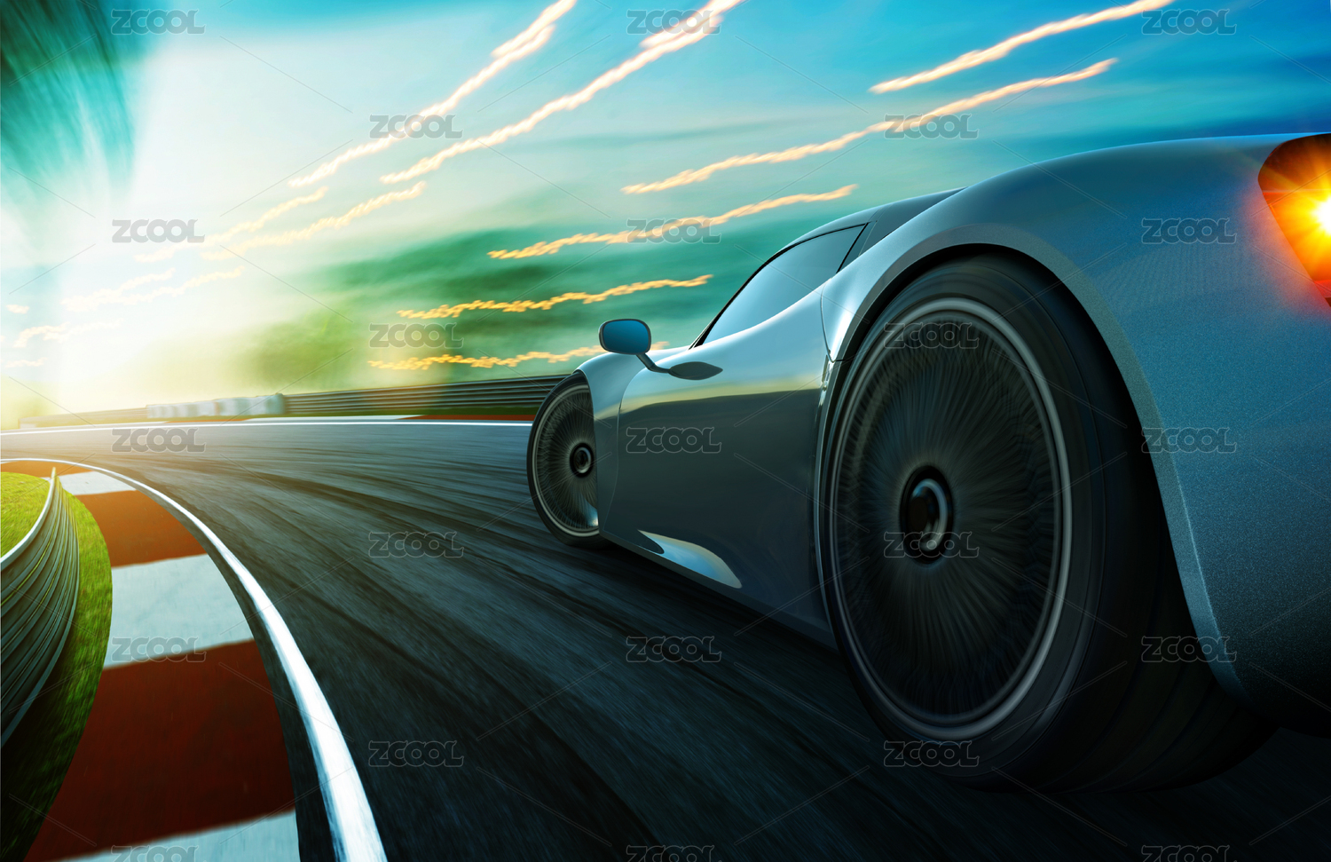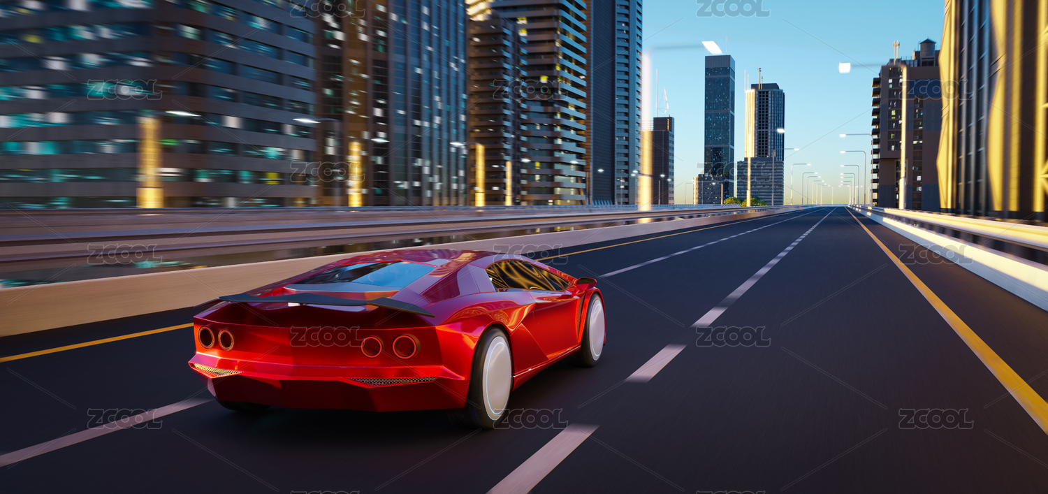 美式肌肉形跑车行驶在晨早的道路 三维渲染
