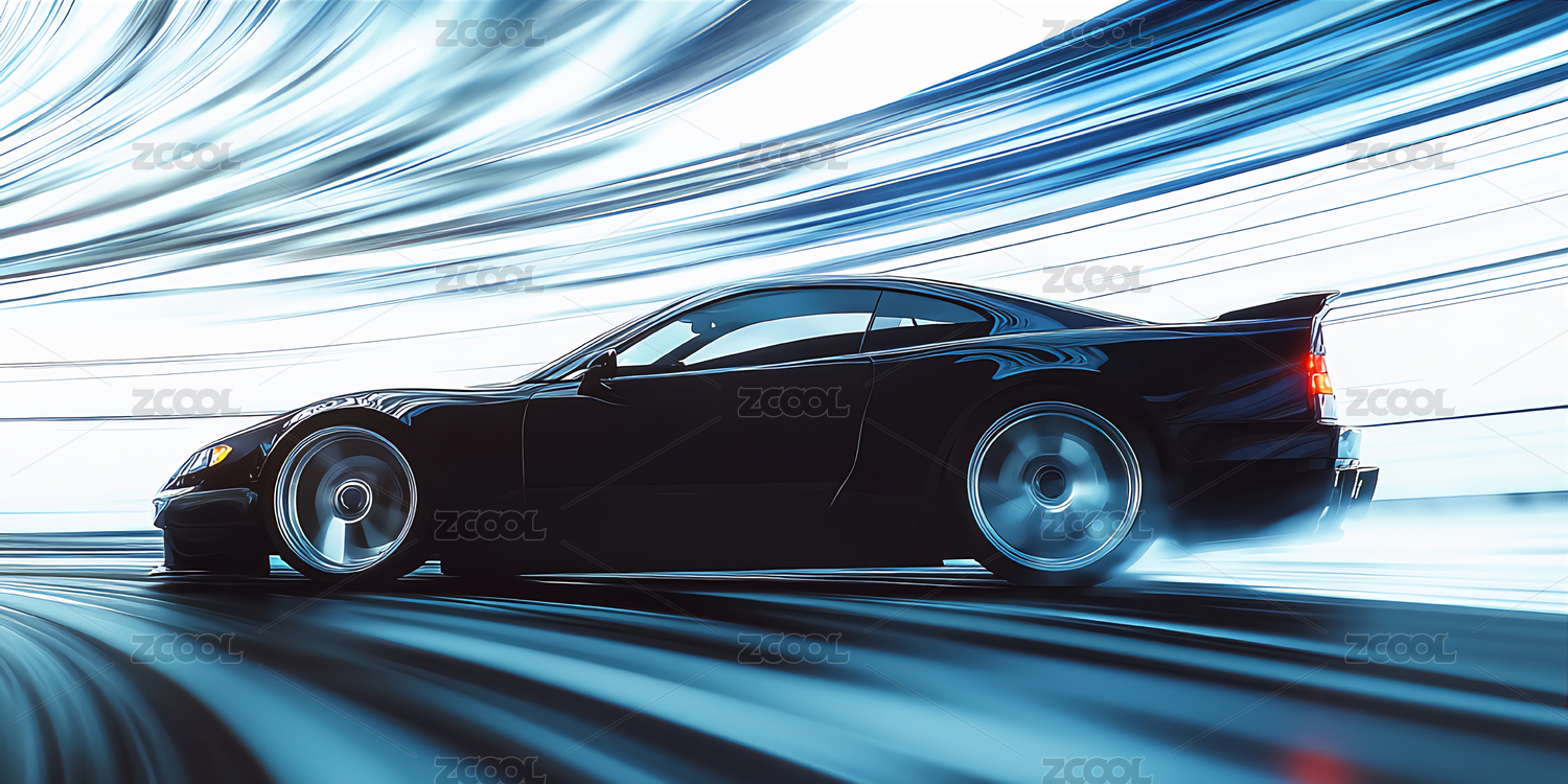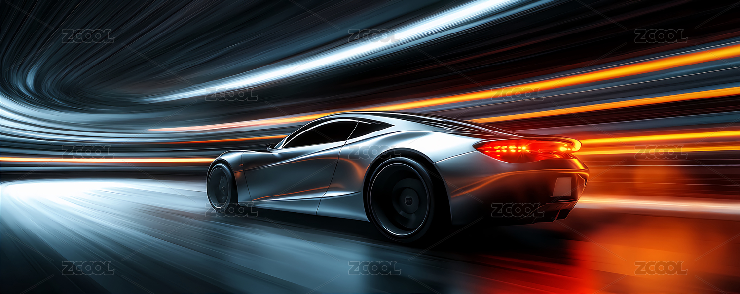 未知品牌汽车在城市曲线道路快速运动,加入霓虹灯动感效果。商业汽车概念图。3D 渲染图 。
