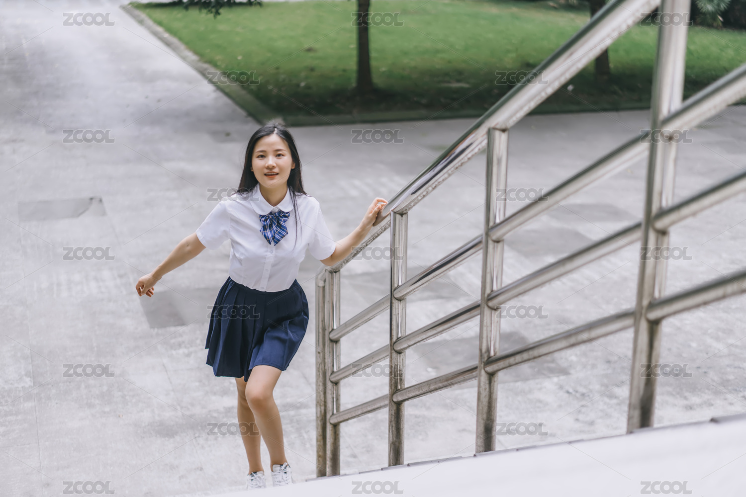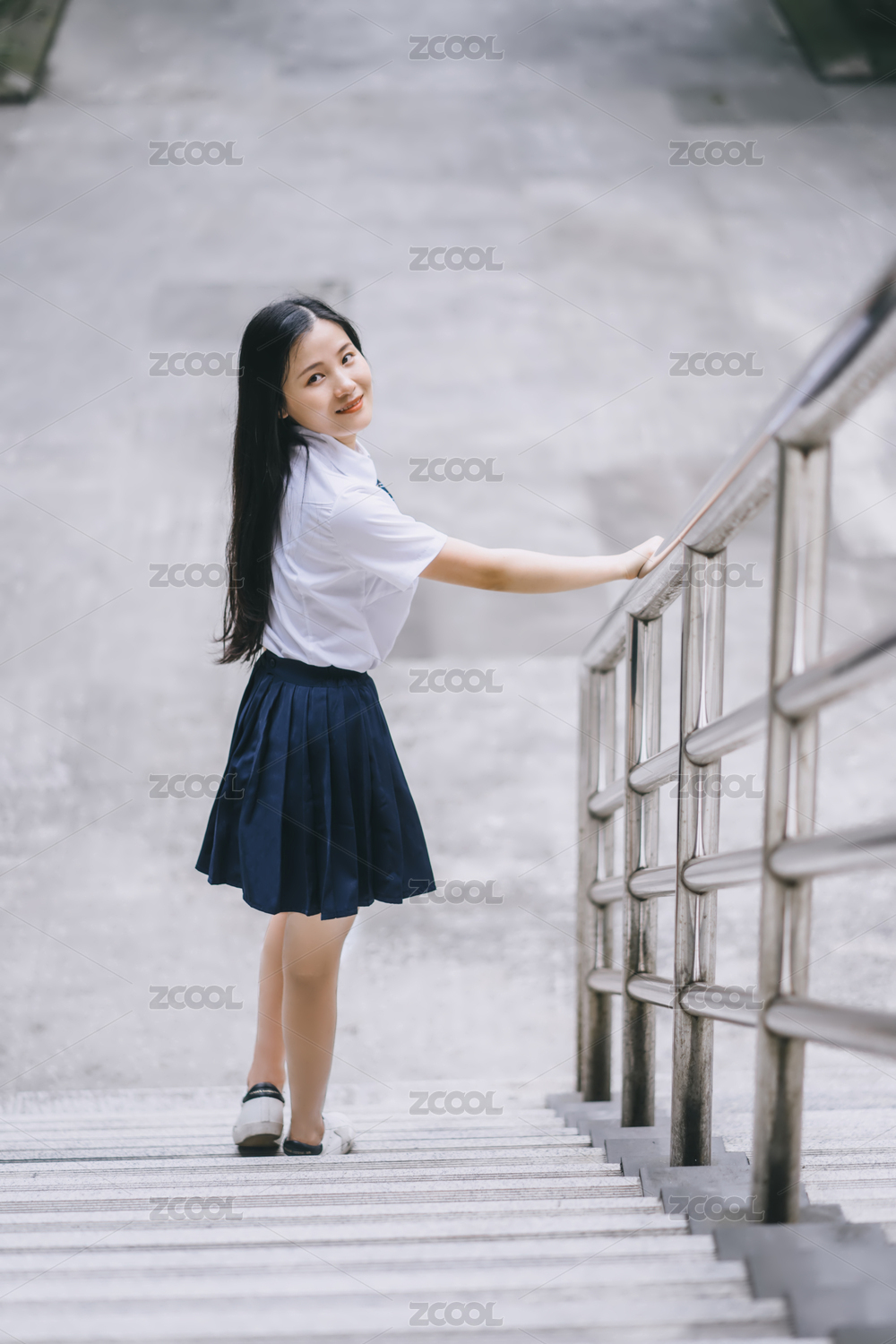 校园楼梯上穿白色校服的女孩