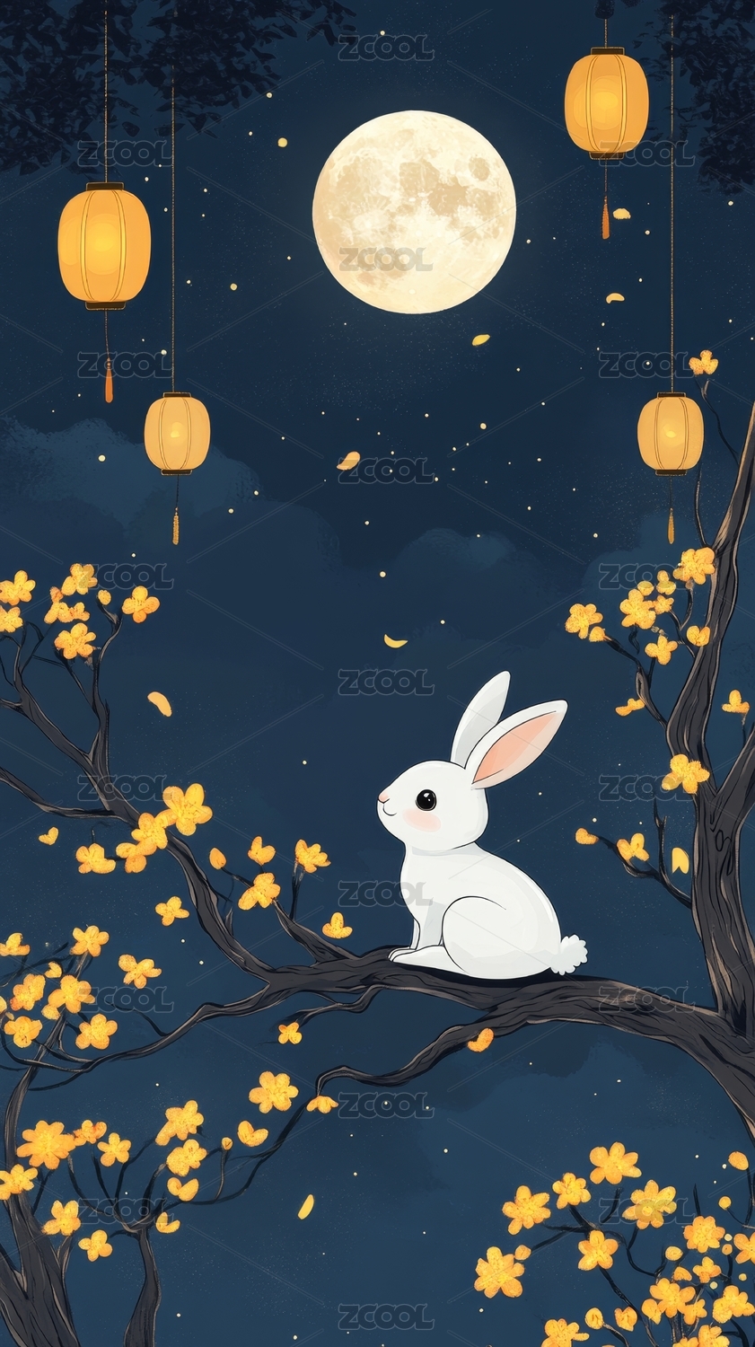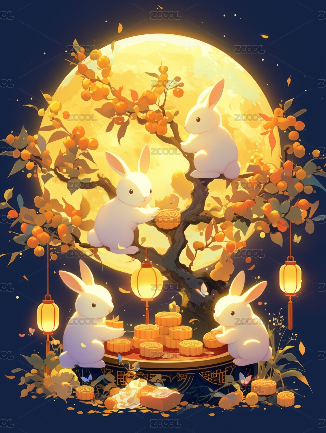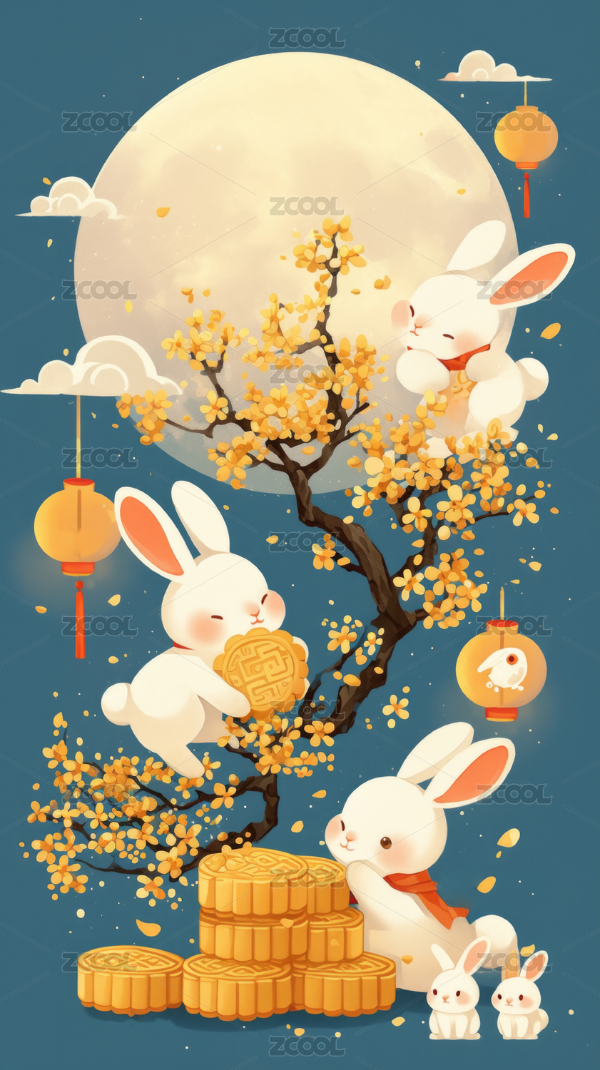中秋,中秋节,玉兔,兔子,月饼,月亮,满月,桂花树,插画,可爱