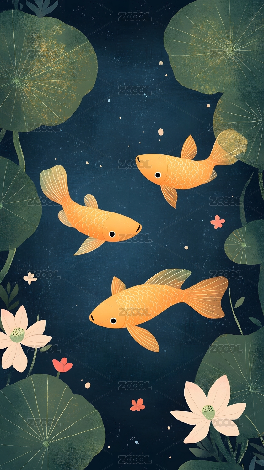 壁纸,装饰画,插画,金鱼,莲花,封面,贴纸,卡片,童装,印染图案