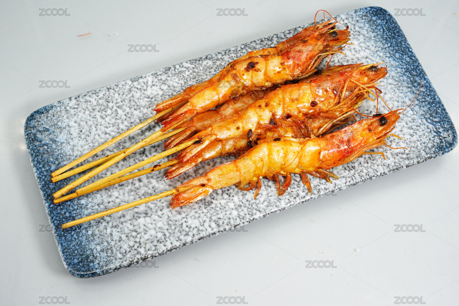 摆在平盘上的香辣串烧大虾
