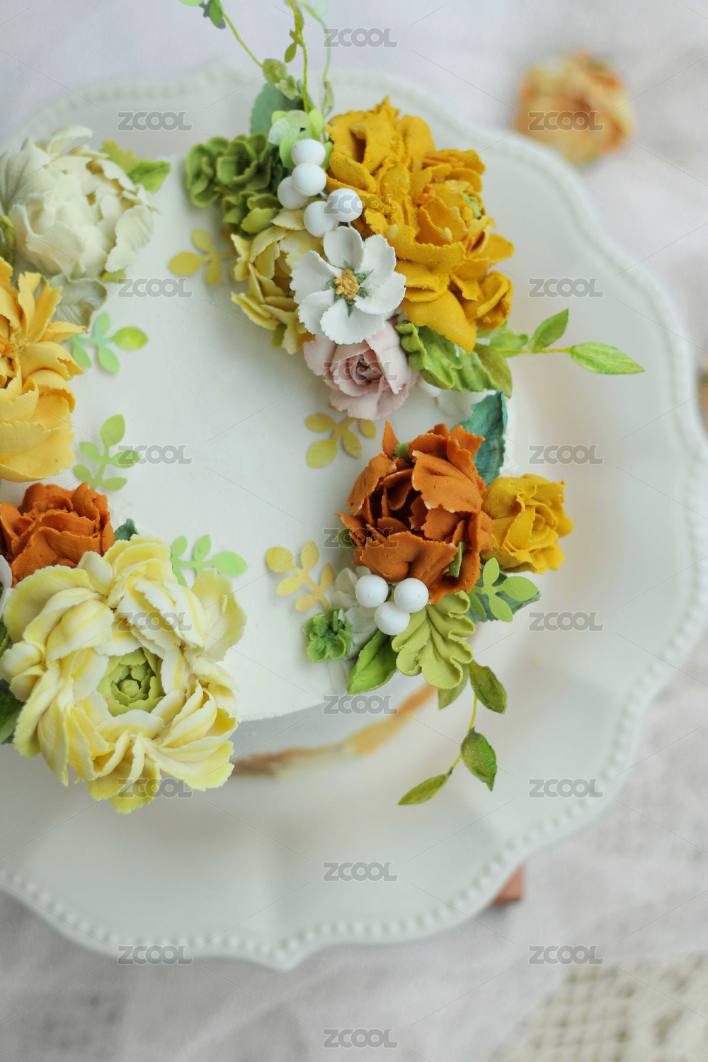放在蛋糕托盘上的两层森系鲜花奶油蛋糕