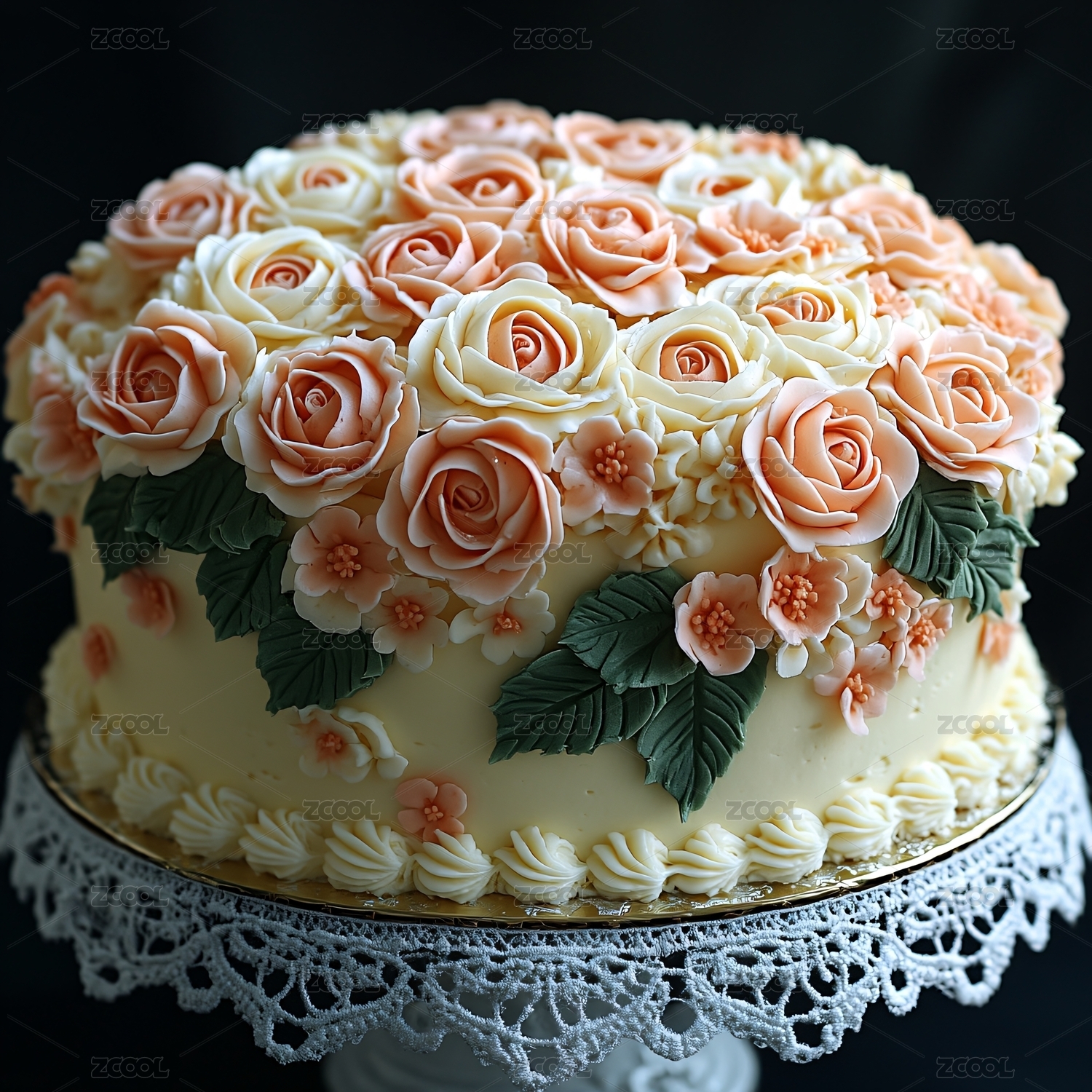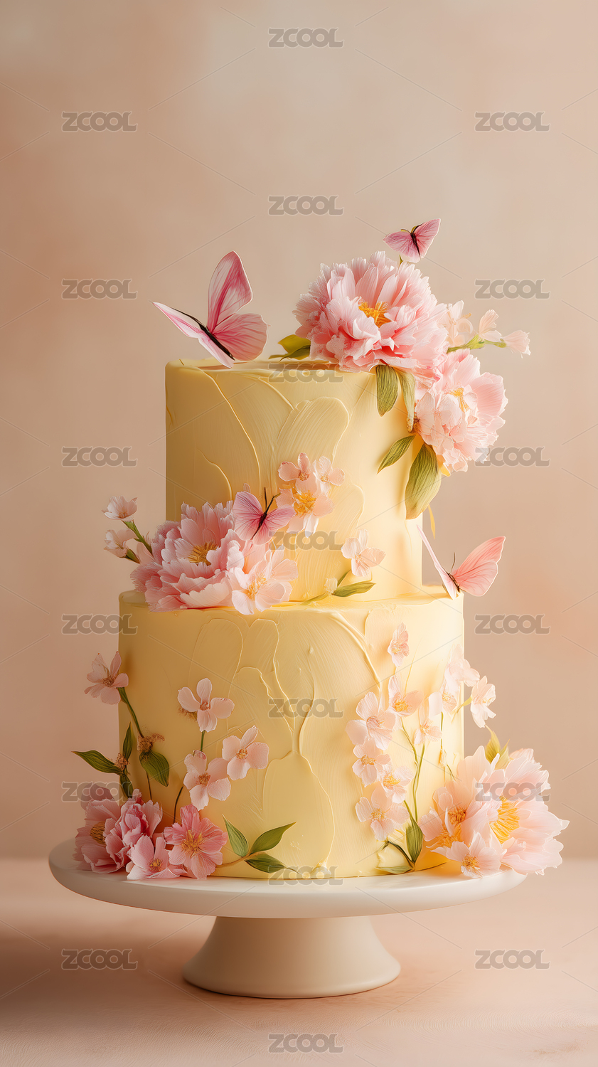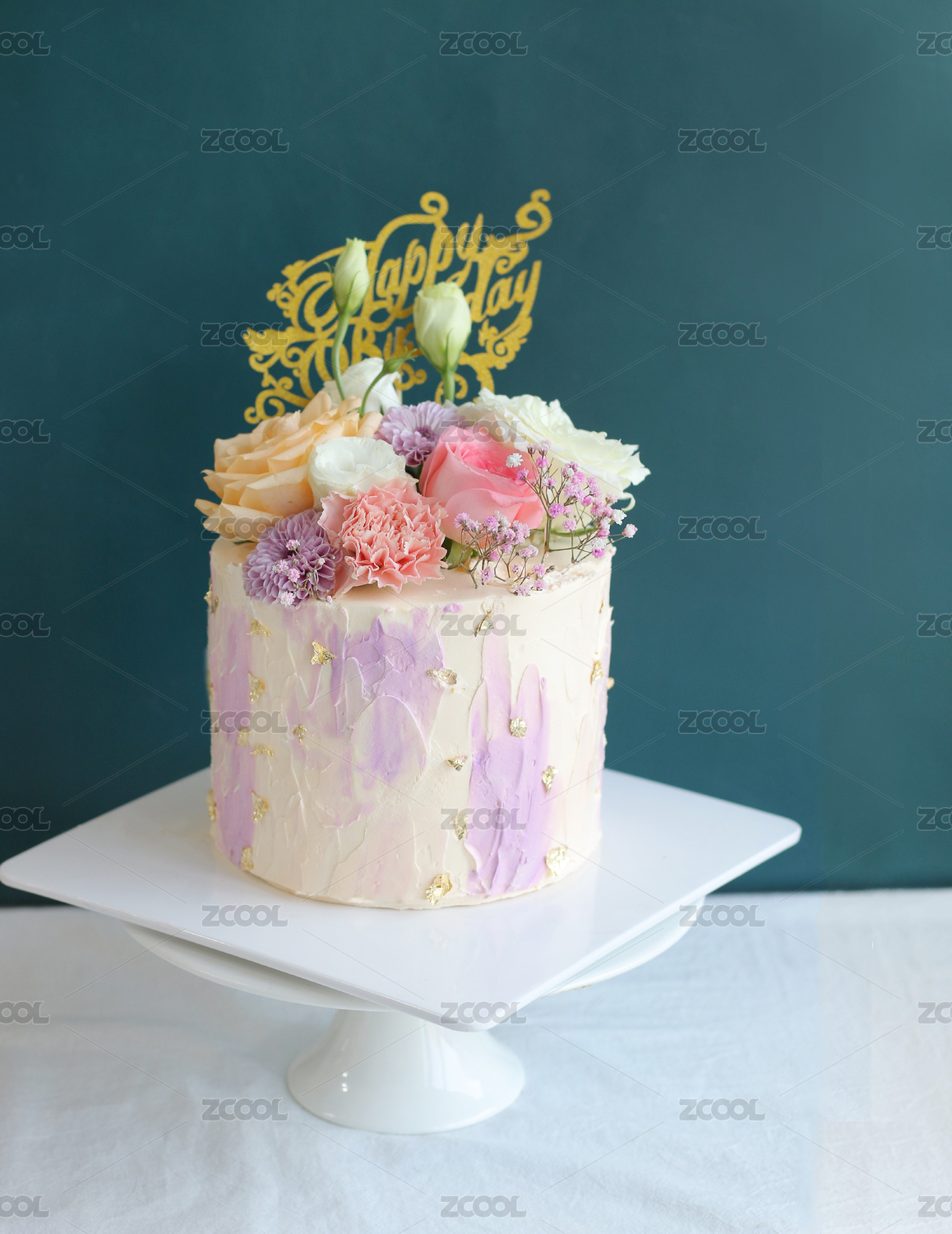 放在蛋糕托盘上的粉色系鲜花蛋糕