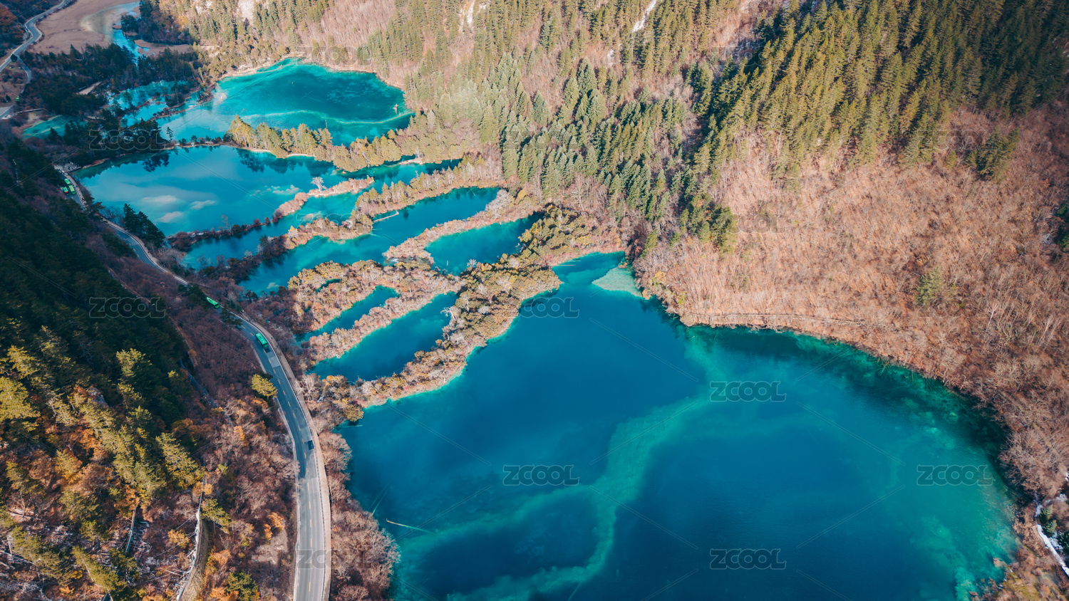 九寨沟秋景中的斑斓湖泊与蜿蜒公路