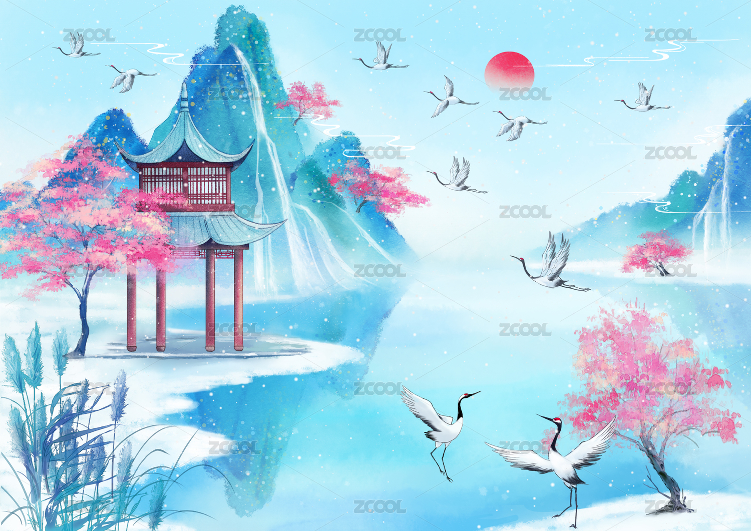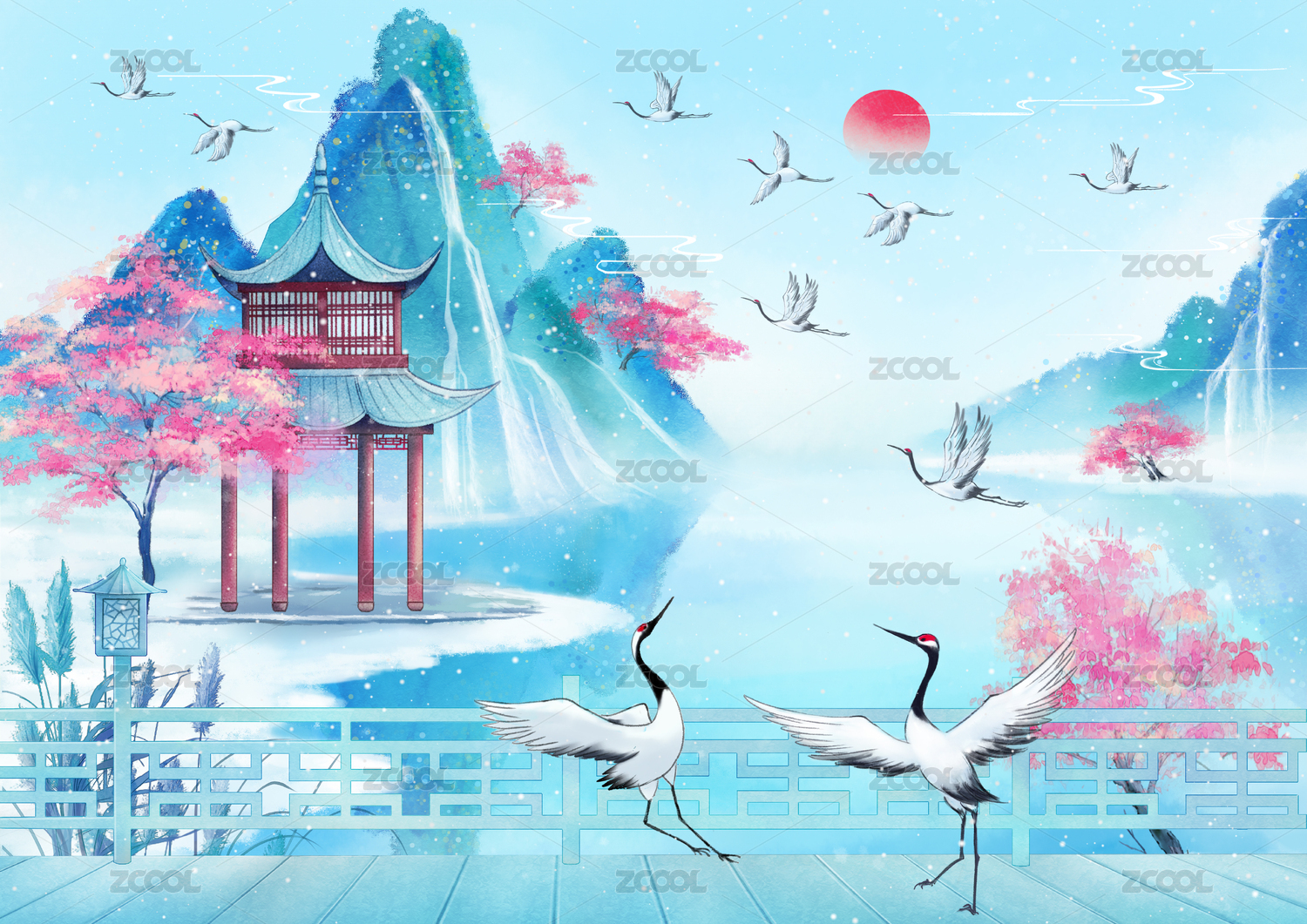 中国风国潮山水画面中有亭子和仙鹤落日插画