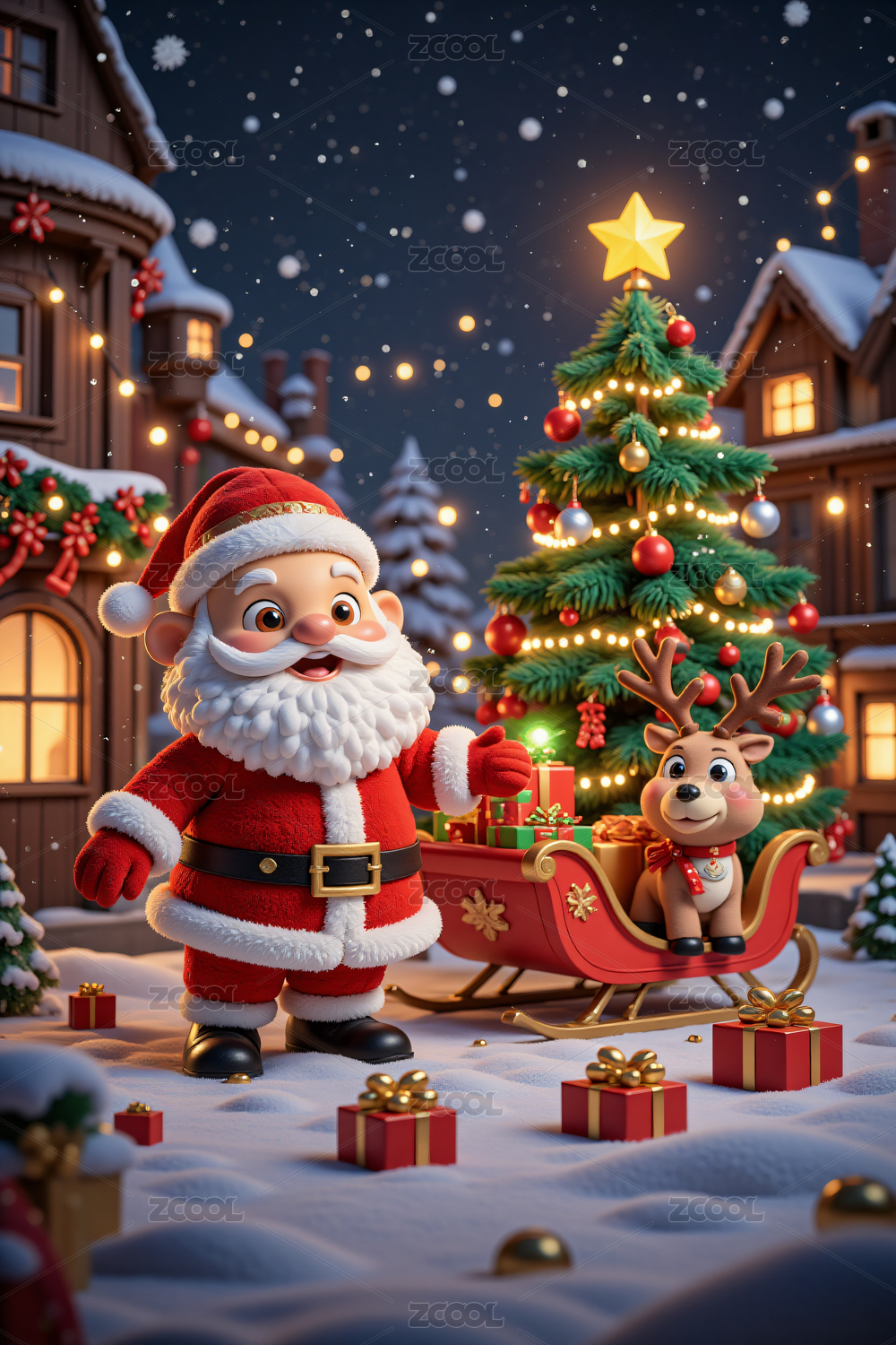 圣诞老人,圣诞树,雪橇车,驯鹿,夜晚,3D