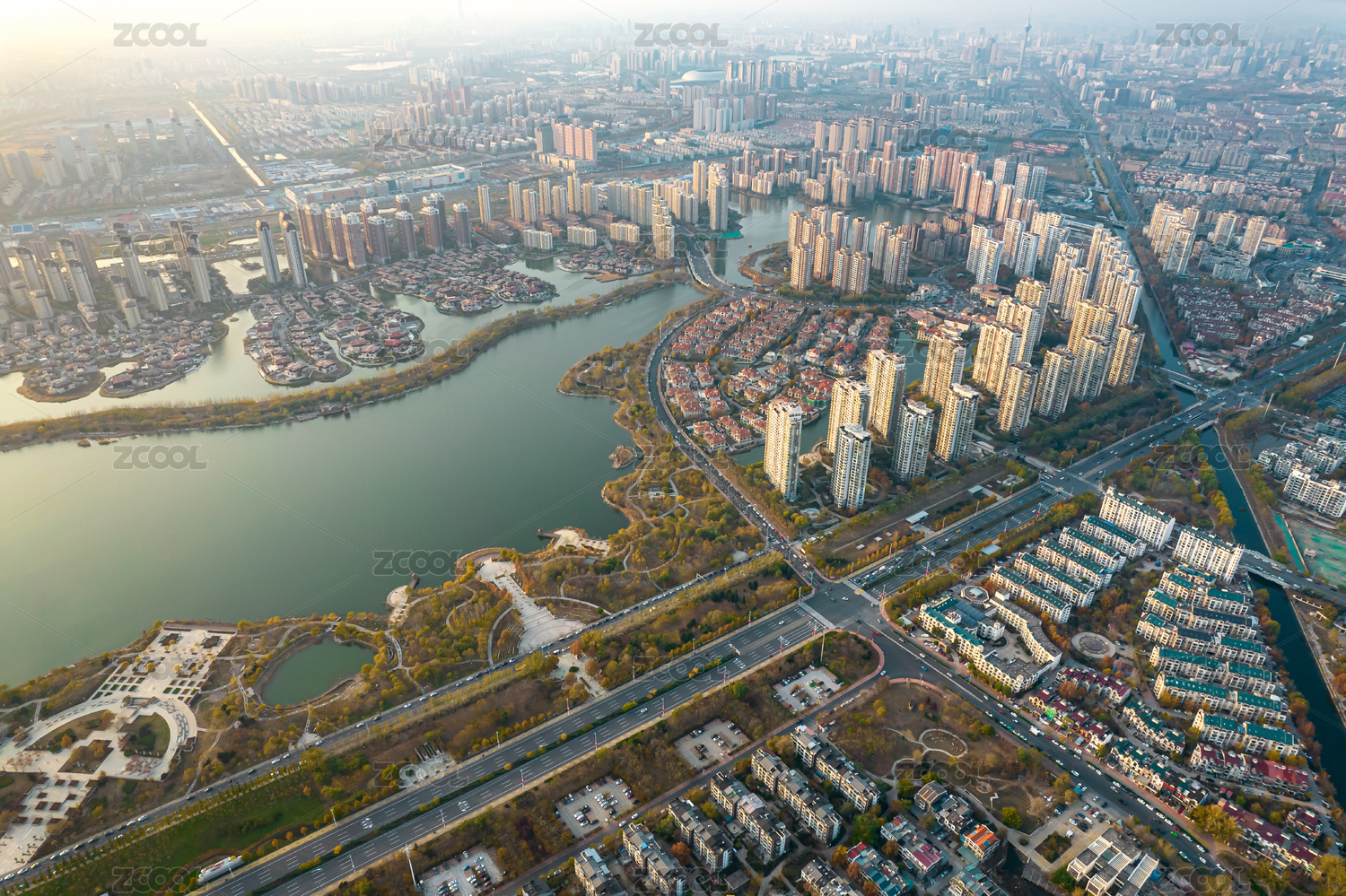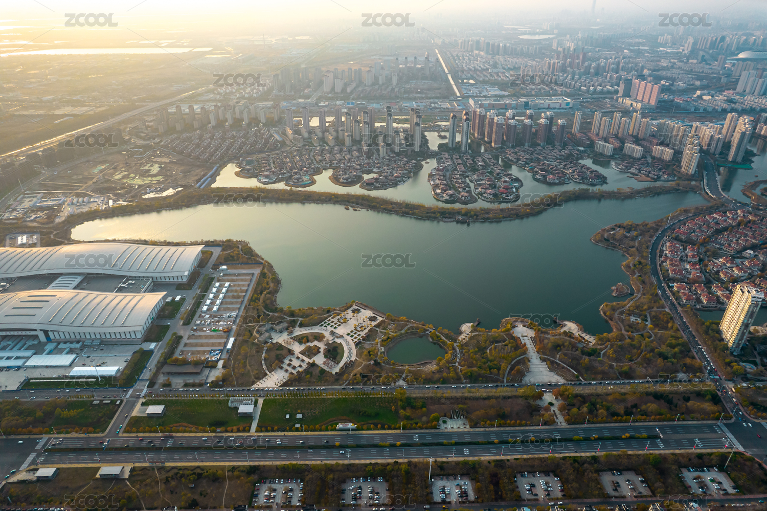 中国天津梅江会展中心梅江公园日落城市风景