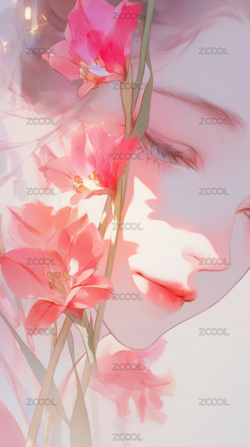 花,山茶花,芍药花,美女,美颜,头像,绘本,少女,唯美,梦幻