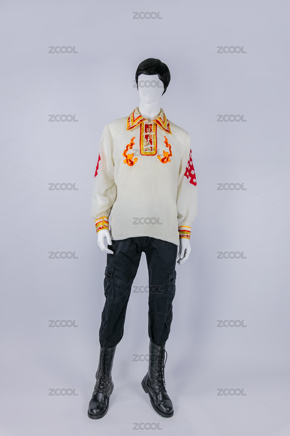 中国藏族男式绣花绸缎衬衫内衣服饰