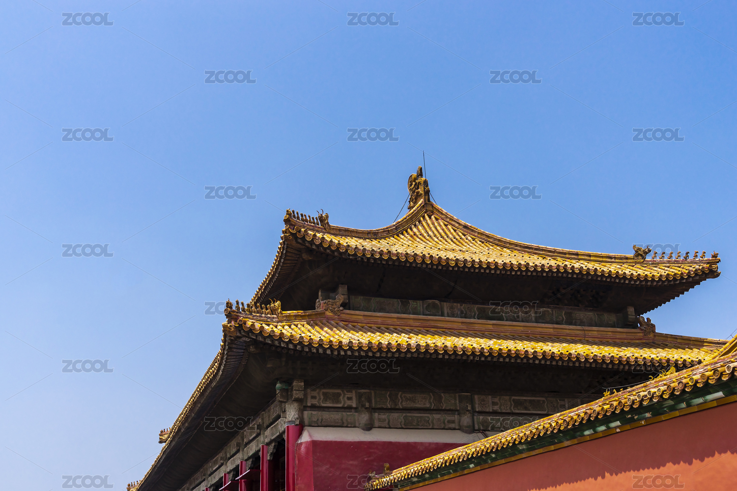 晴朗的蓝天下中国北京故宫博物院乾清宫屋顶特写