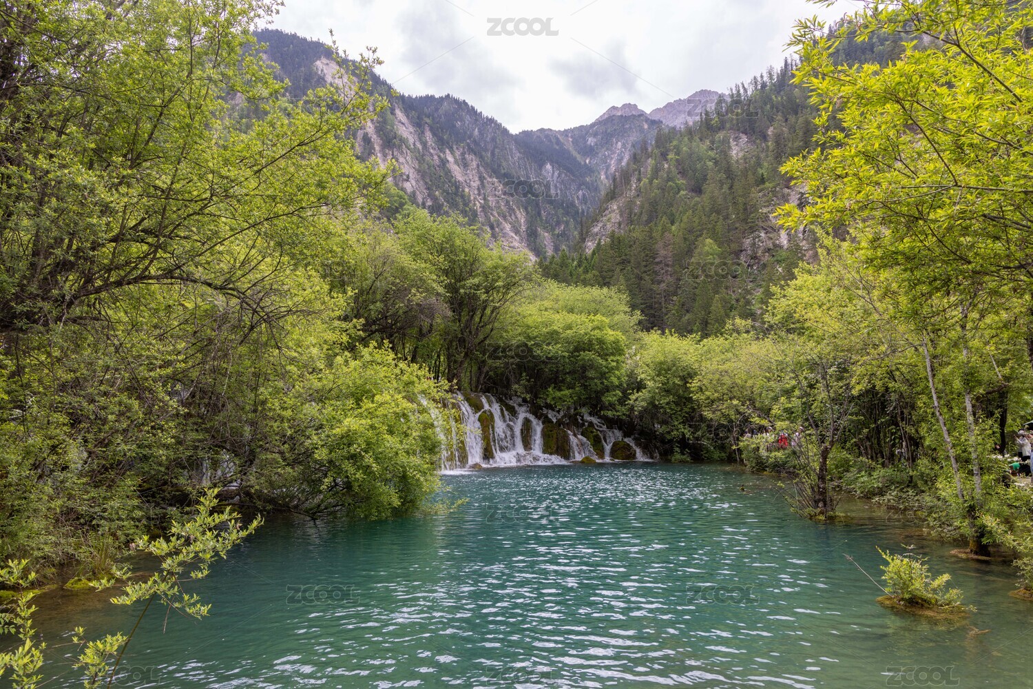 晴朗夏季上午拍摄的四川九寨沟箭竹海瀑布