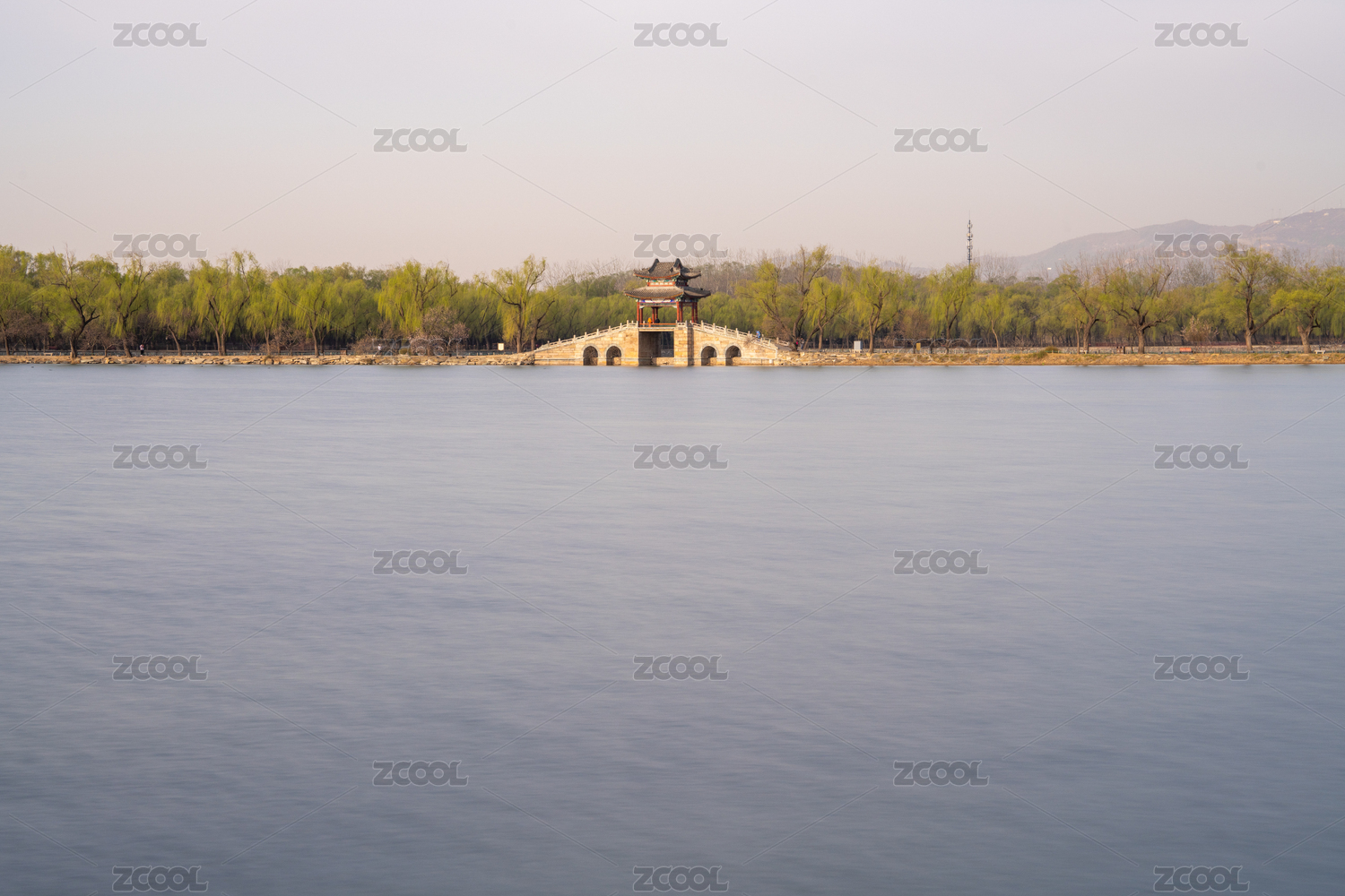 晨阳光下的颐和园西堤练桥与玉泉山玉峰塔