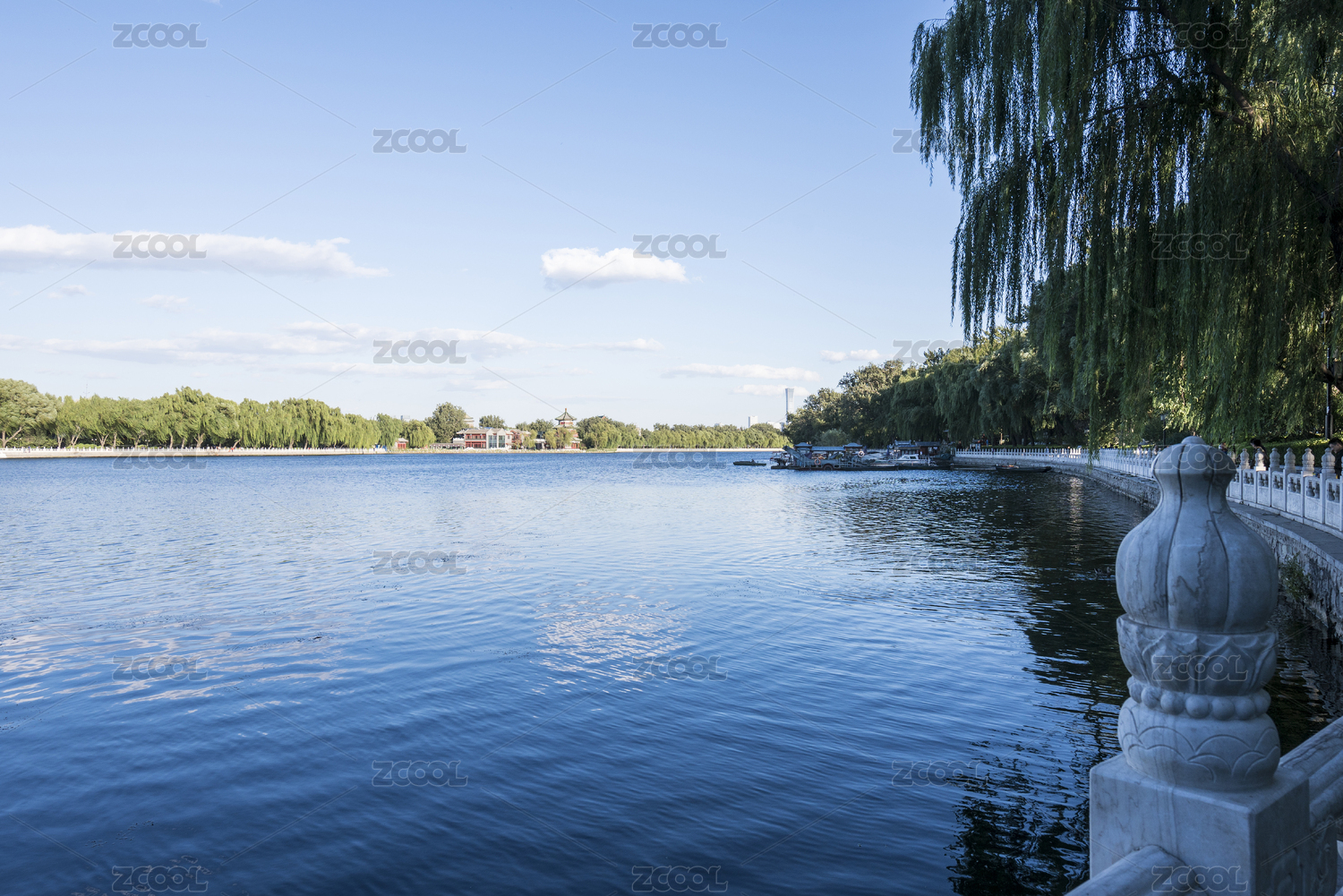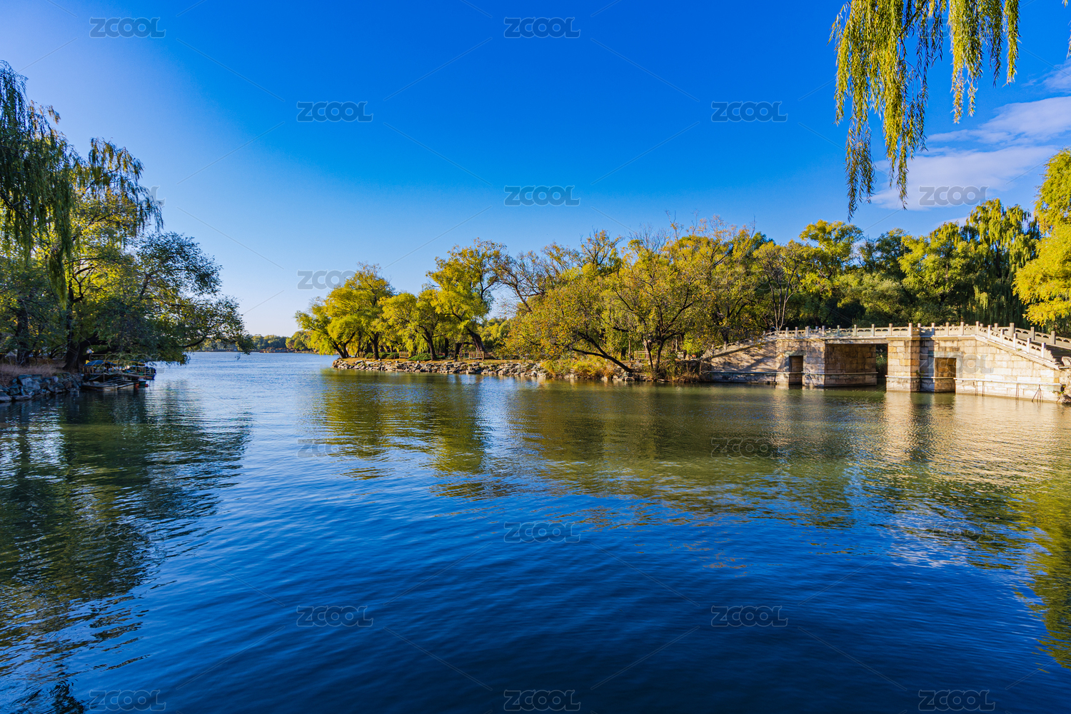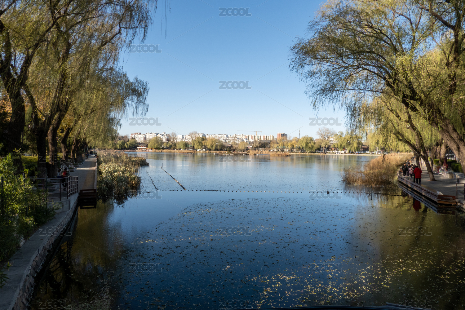 初冬时节碧空映衬下的北京什刹海后海景区风