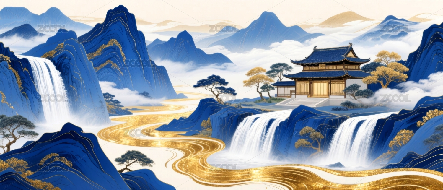 新国风山水鎏金风景插画