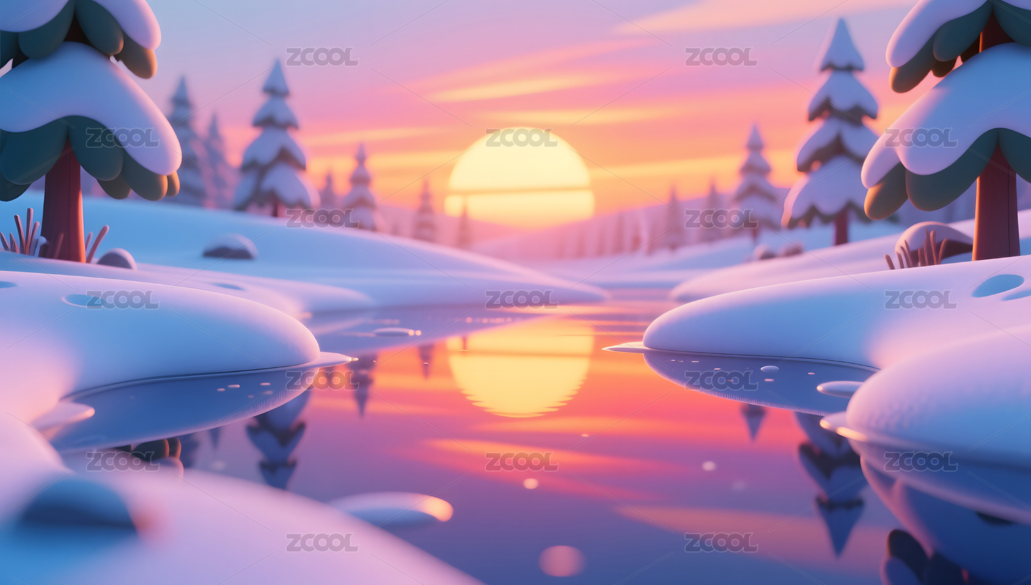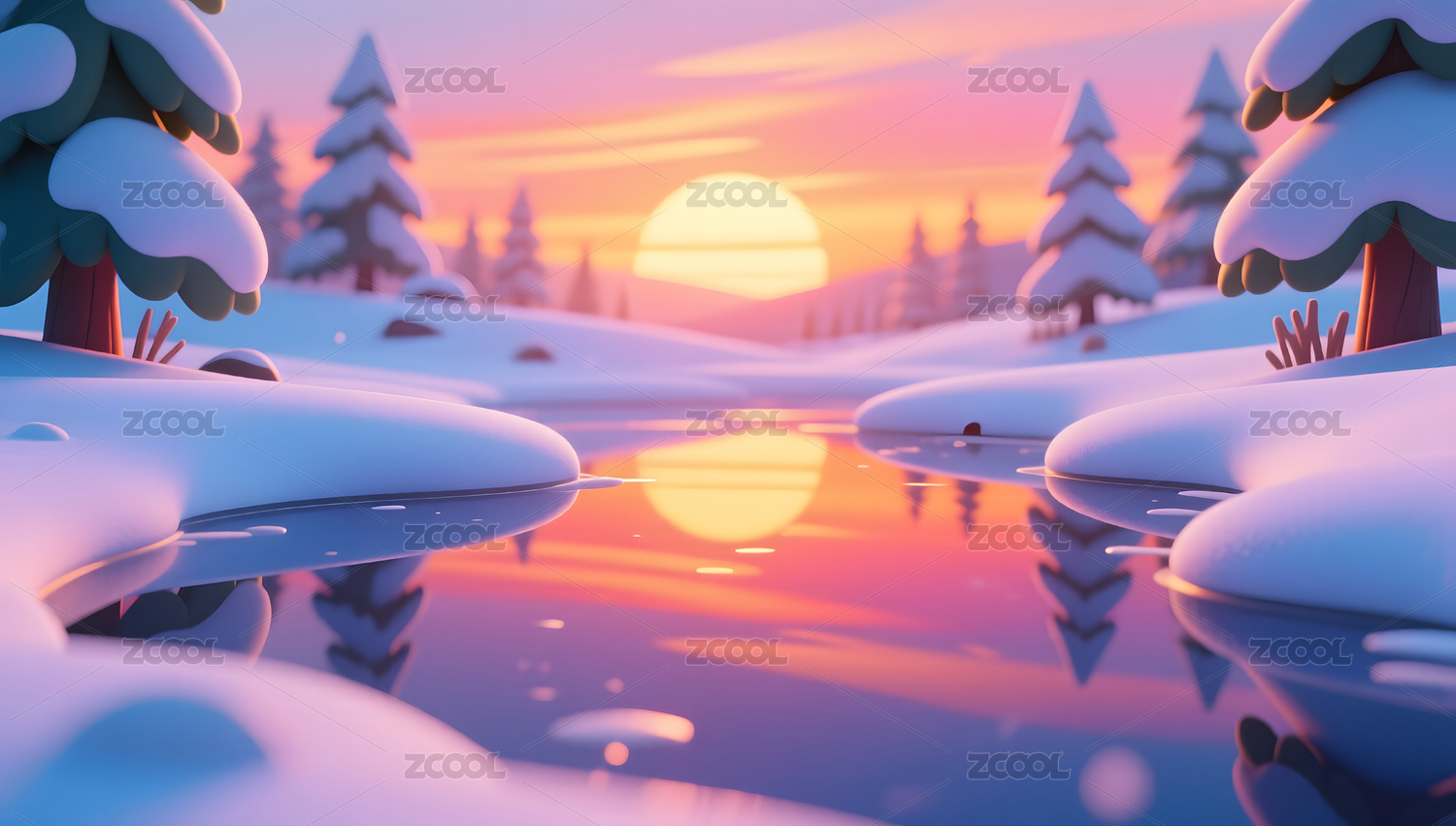 冬天清新明亮下雪的山丘河谷3D卡通背景