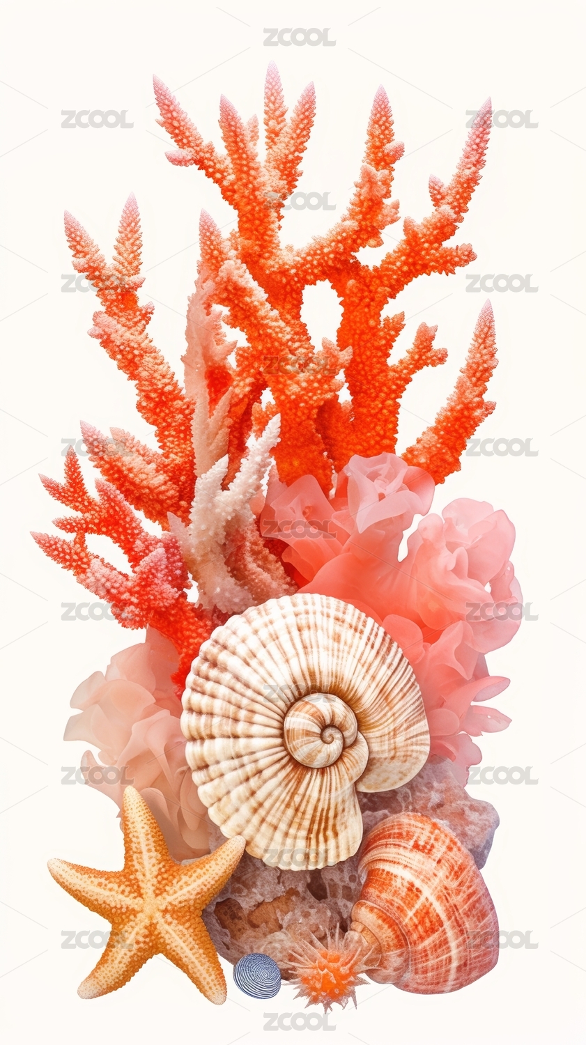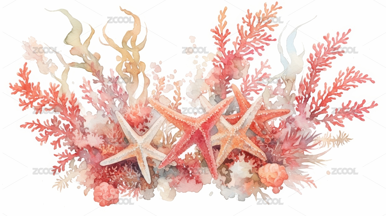 珊瑚,贝壳,海底,海草,海星,手绘,插画,背景,白色,海洋