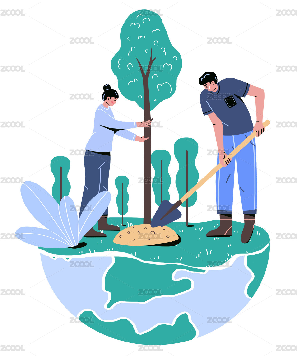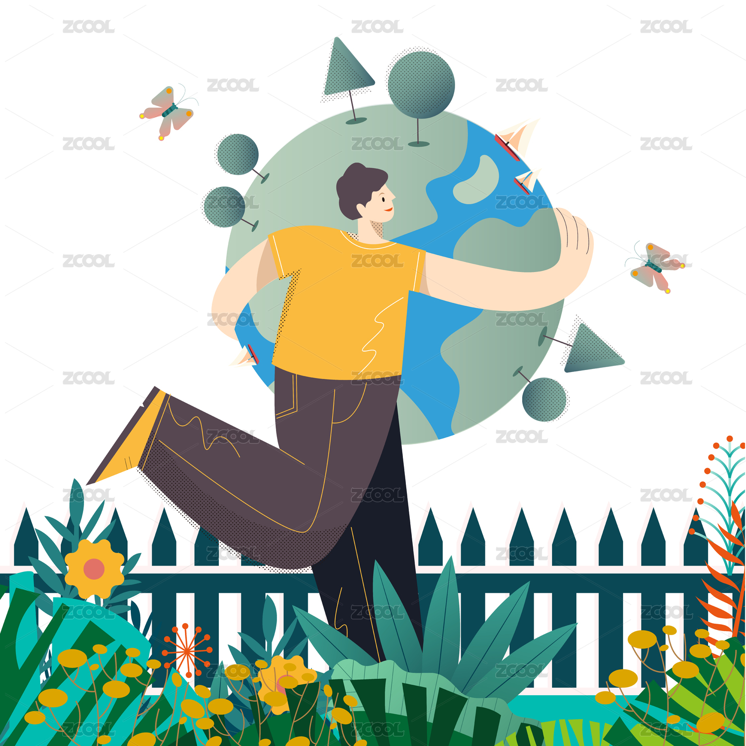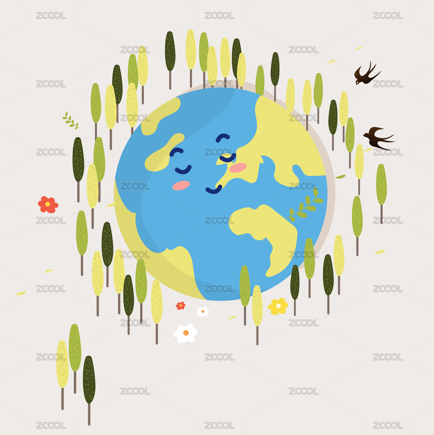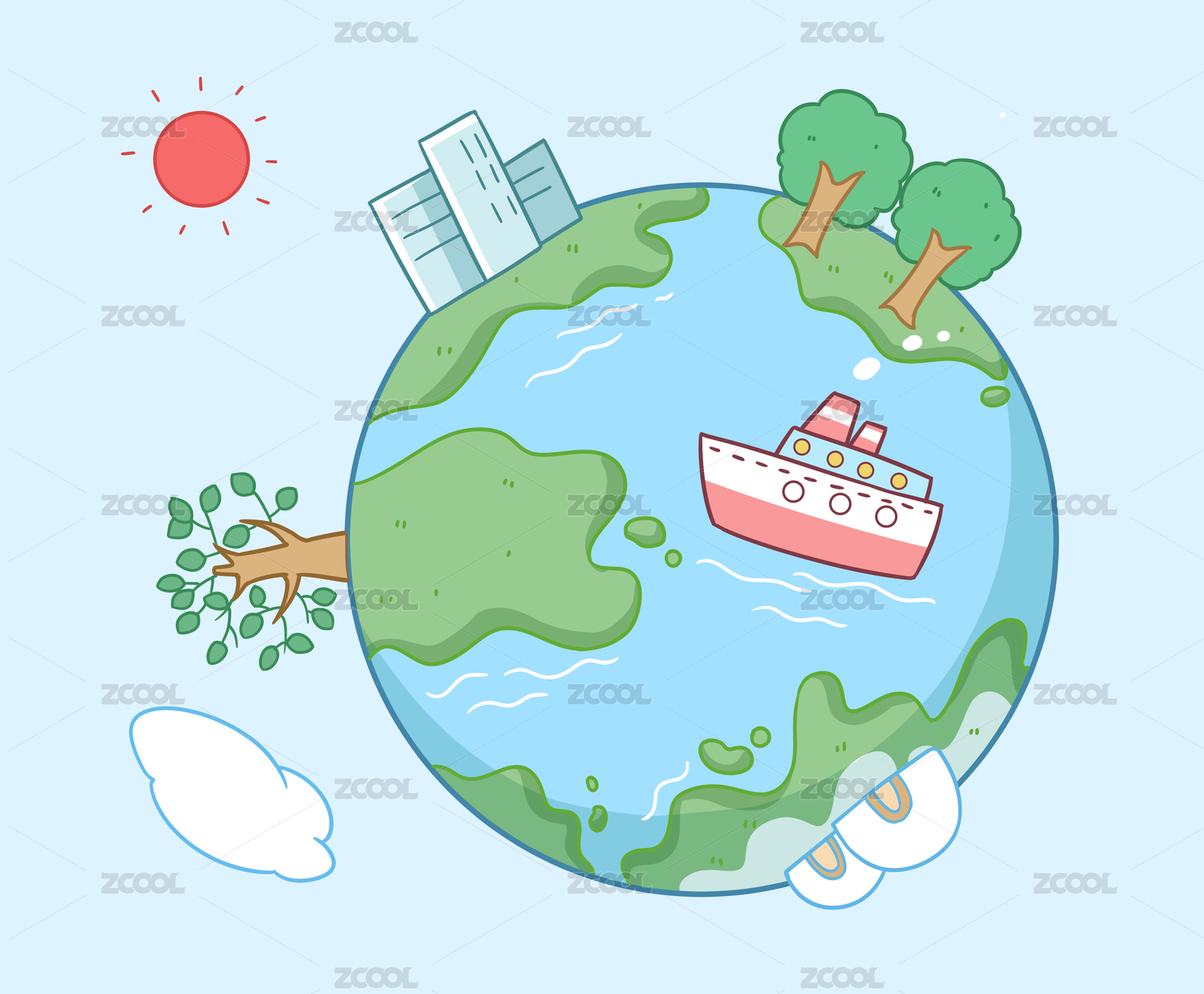 Q版线条儿童插画绿色的地球上有海洋植物和