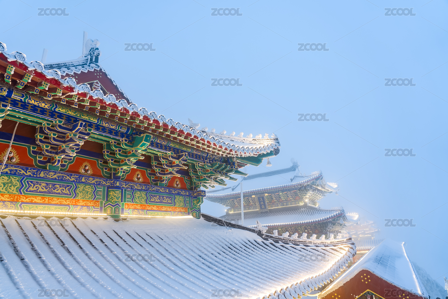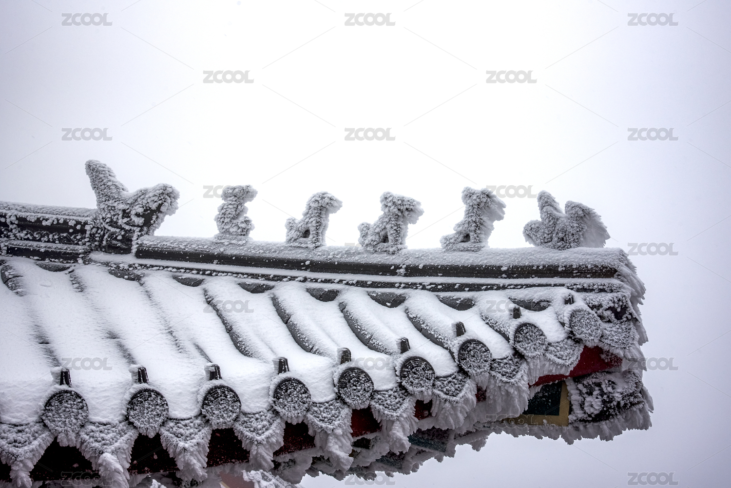 冬天寒冷大雪建筑历史屋檐彩绘旅游背景老君